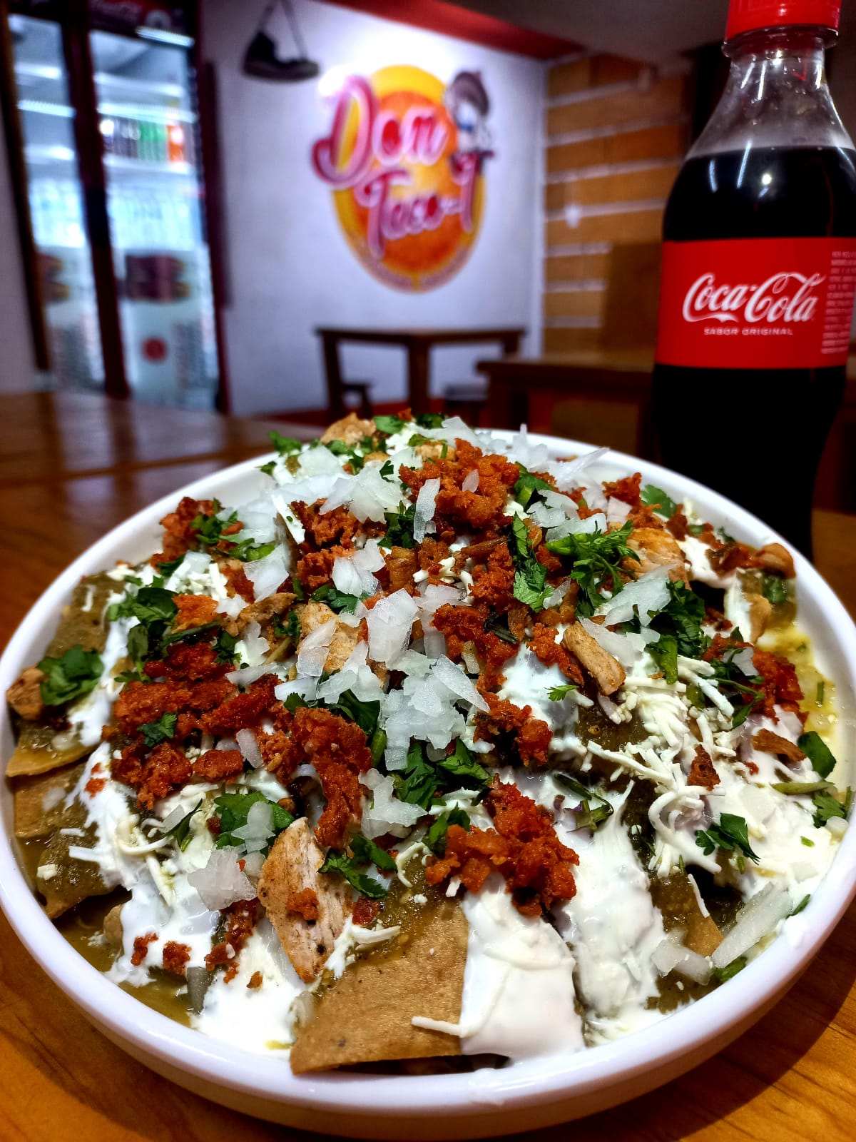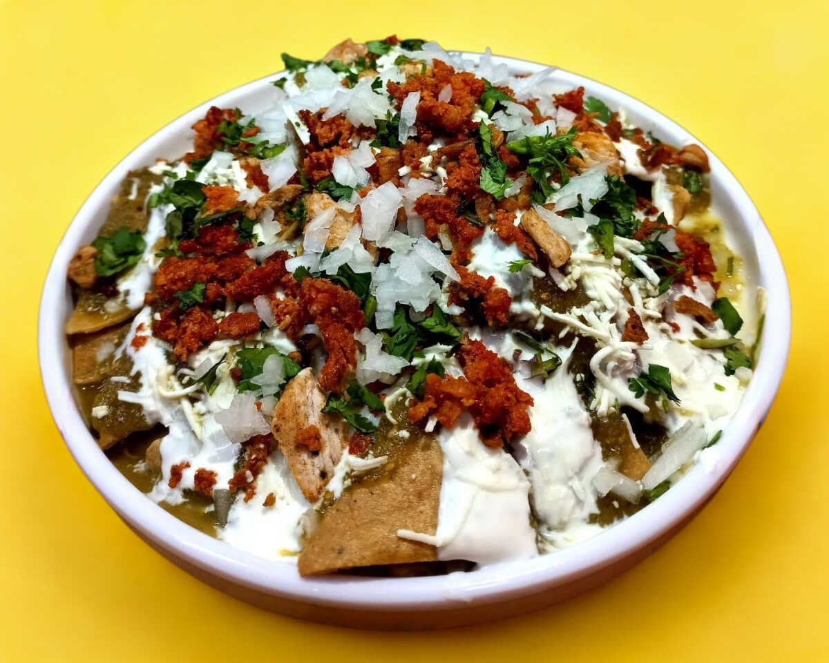 Crujientes totopos con la carne de tu elección, cubiertos en salsa verde de la casa, crema, queso, cebolla y cilantro.