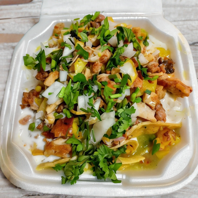 Crujientes totopos con la carne de tu elección, cubiertos en salsa verde de la casa, crema, cebolla y cilantro.