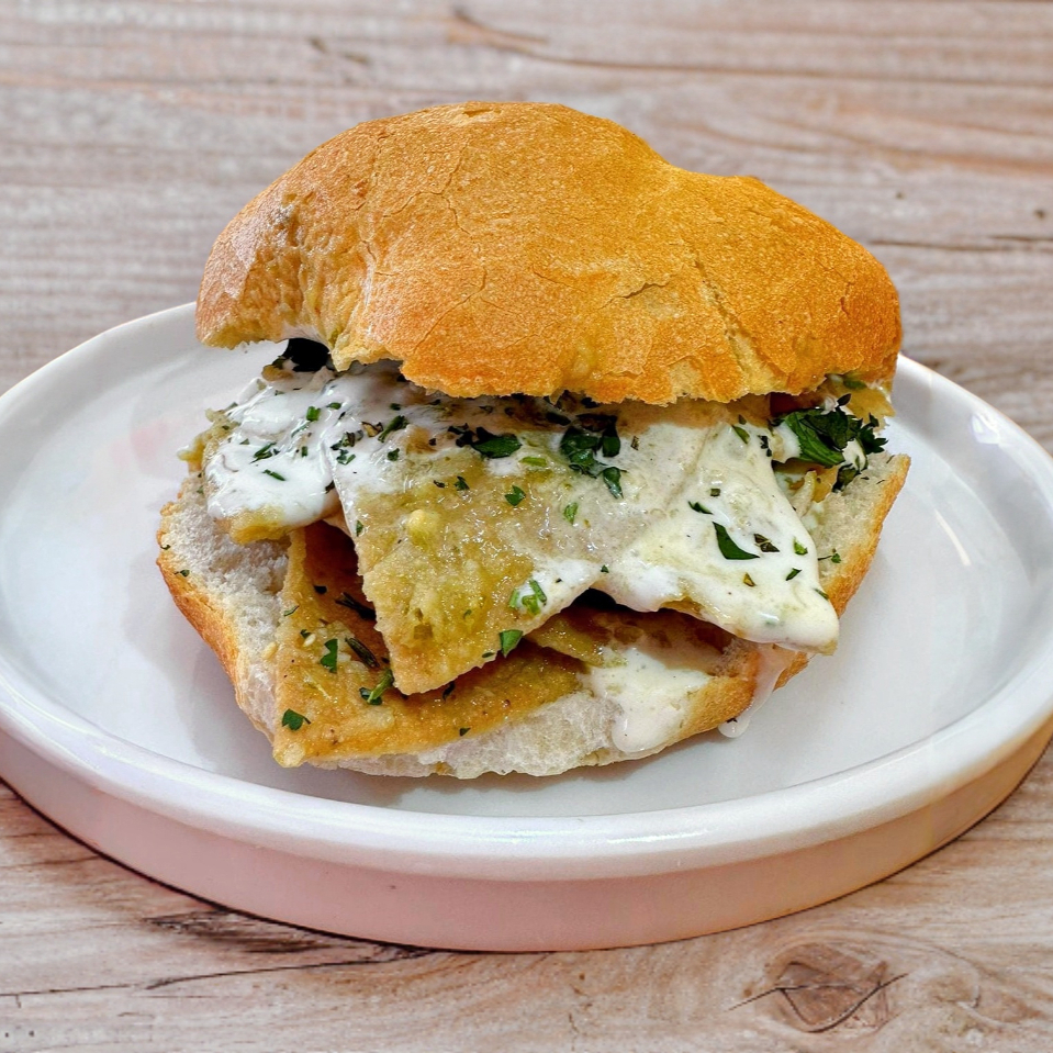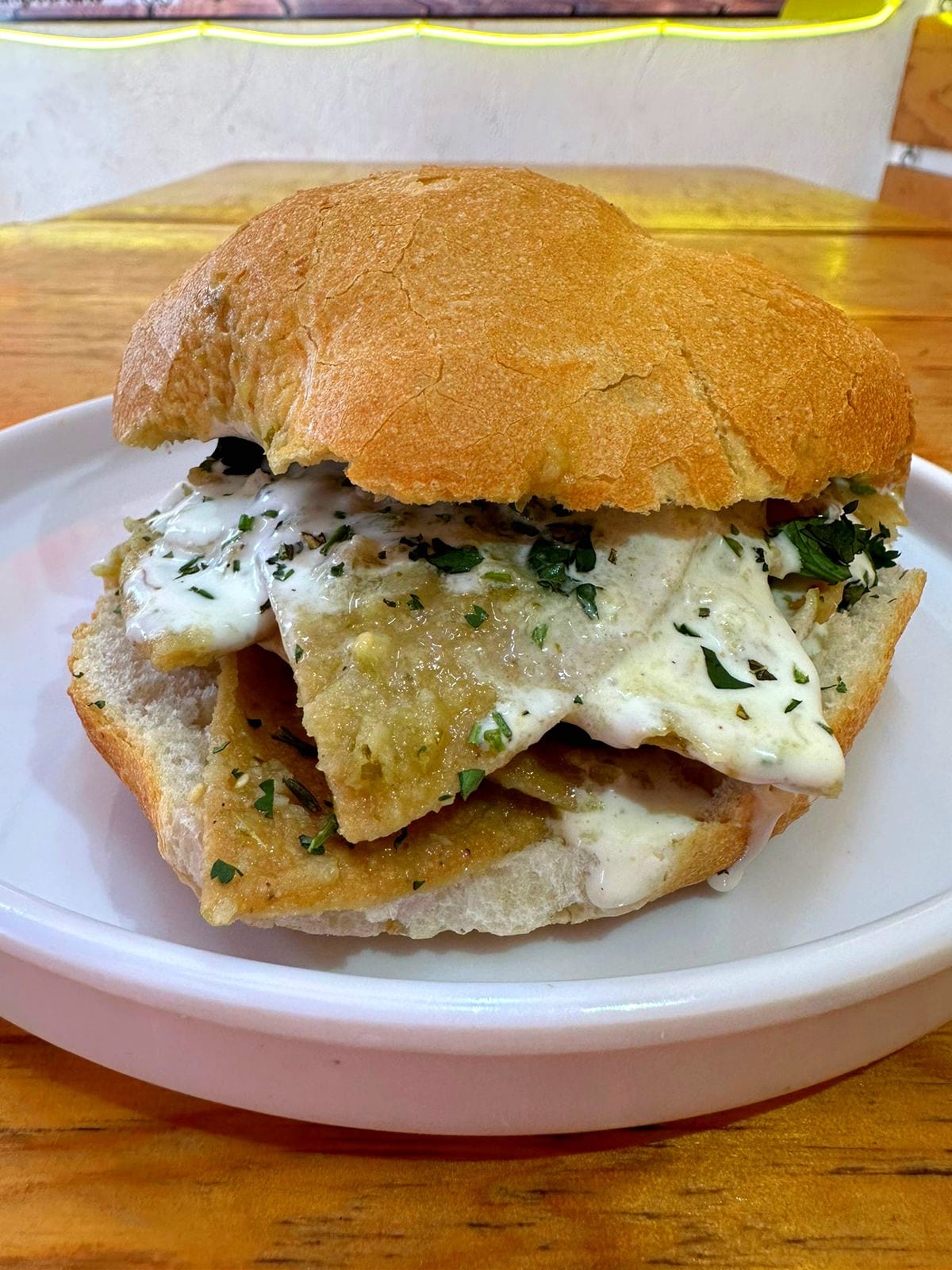 Pan recién salido del horno con totopos bañados en salsa verde y carne que elijas.