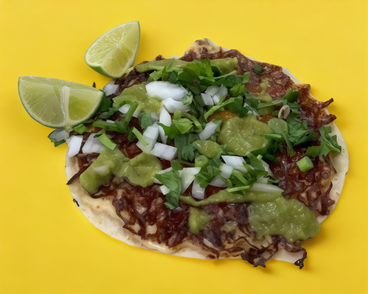 Tortilla de harina, carne de su elección y una capa de queso manchego ligeramente quemada, incluye aparte limones, cebolla, cilantro, salsa verde y roja.