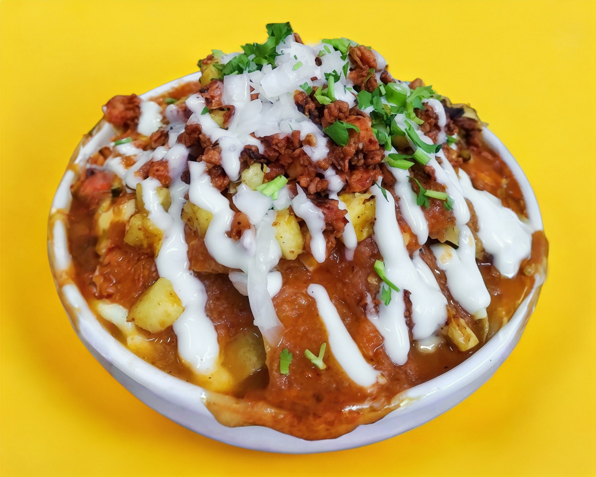 Crujientes totopos con la carne de tu elección, cubiertos en salsa roja de la casa, crema, queso, cebolla y cilantro.