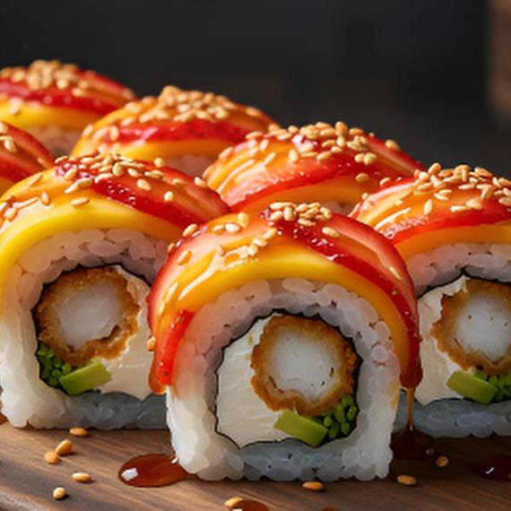 CUBIERTA DE FRESA, MANGO Y ANJONJOLI CON RELLENO DE CAMARON EMPANIZADO , FILADELFIA Y AGUACATE