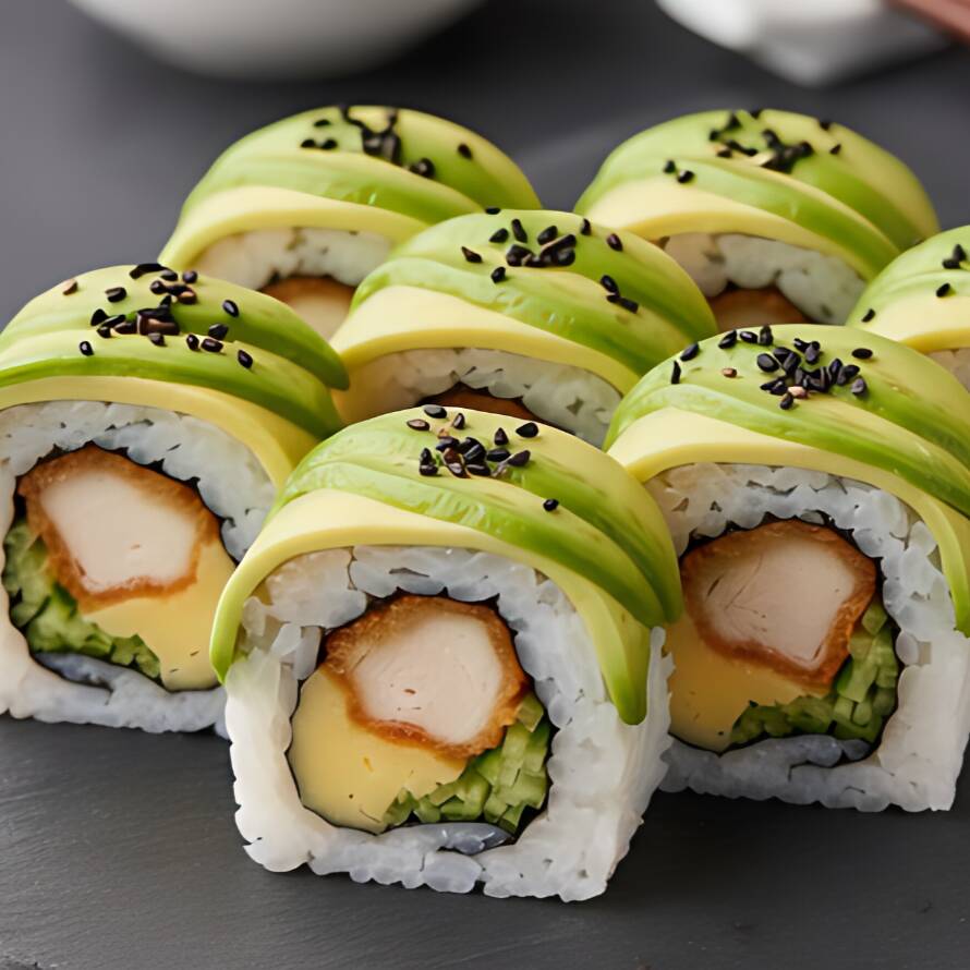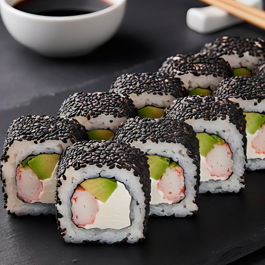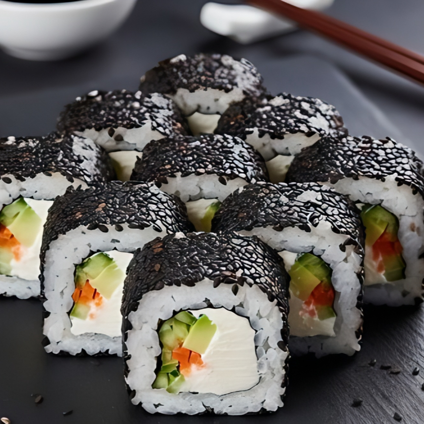 CUBIERTA DE ALGA NORI MAS ANJONJOLI CON RELLENO DE SURIMI,FILADELFIA Y AGUACATE