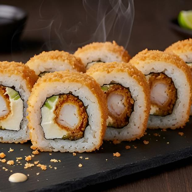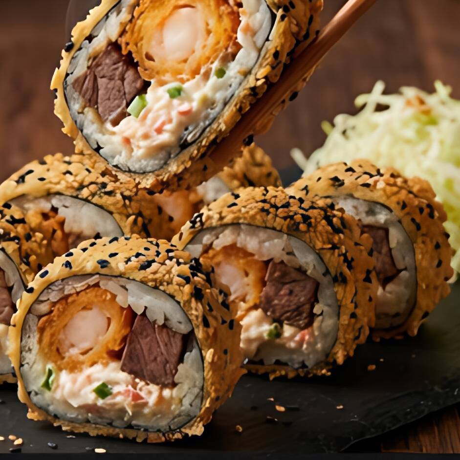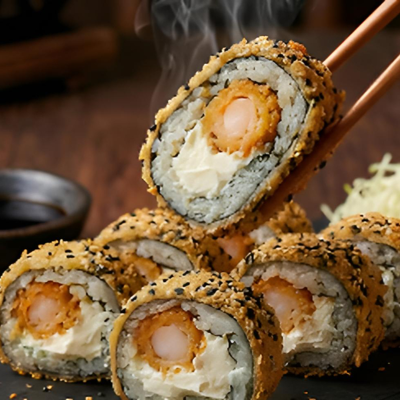 CUBIERTA DE ALGA EMPANIZADA Y ANJONJOLI CON RELLENO DE CAMARON EMPANIZADO Y FILADELFIA