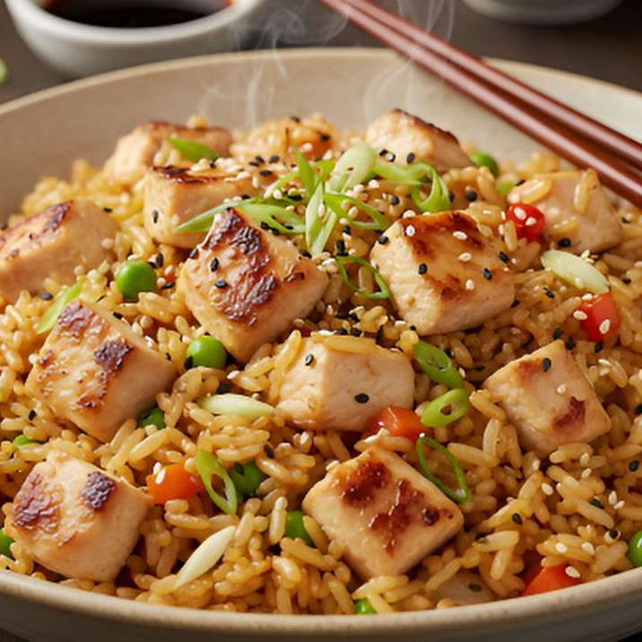 EL YAKIMESHI DE POLLO ES UN PLATO DE ARROZ FRITO MEZCANDO LOS SABORES CON CALABACITA , ZANAORIA , CEBOLLINO, HUEVO Y CUBOS DE POLLOS PERFECTAMENTE SELLADOS