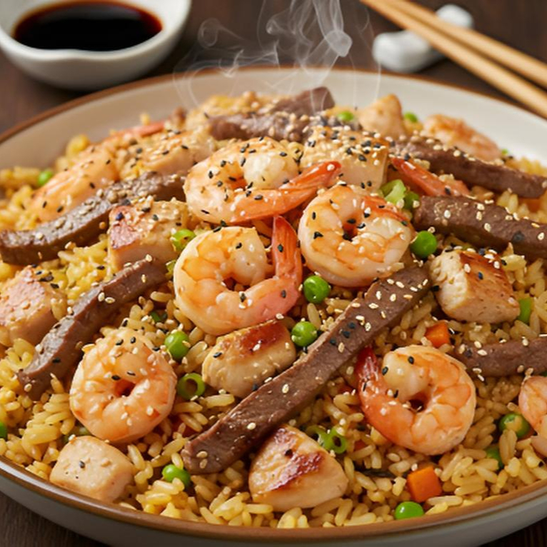 CONSISTE EN TRANSFORMAR EL EL ARROZ BLANCO EN UNA EXPLOSION DE SABORES SALTEANDO EN UN WOK BIEN CALIENTE CUBOS DE POLLO TIRAS DE BISTEC Y CAMARON HASTA Q QUEDEN PERFECTAMENTE SELLADOS