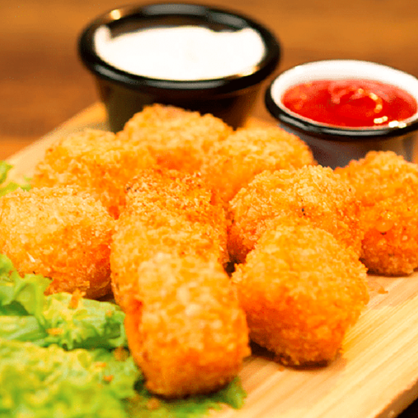 8 Cuadritos de queso panela empanizados + porción de ensalada + salsa a elegir