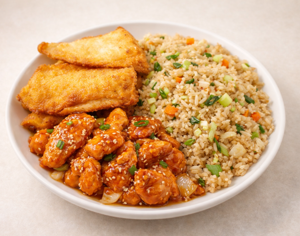 1 Guarnición (250gr) + 1 Guisado a Escoger (200 gr) + Vegetales al Wok (250 gr) + Galleta de la Suerte