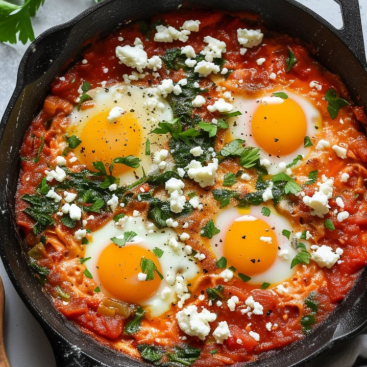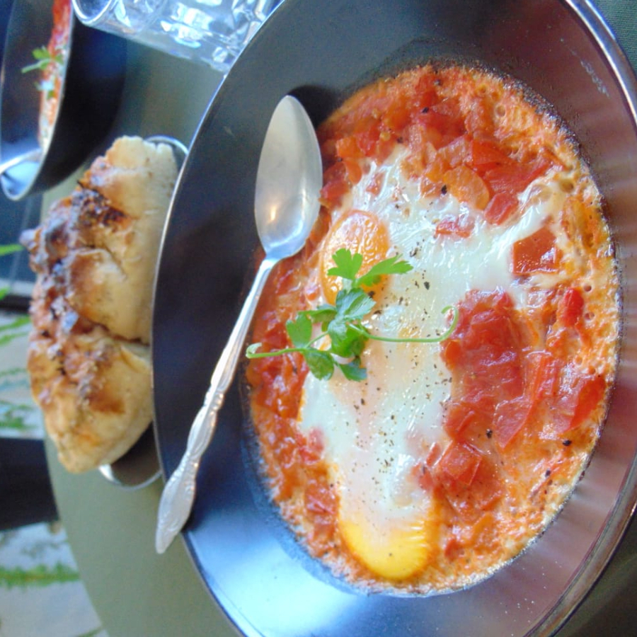 Huevos escalfados en salsa de tomate y pimiento con queso fresco, acompañado de focaccia de masa madre del día