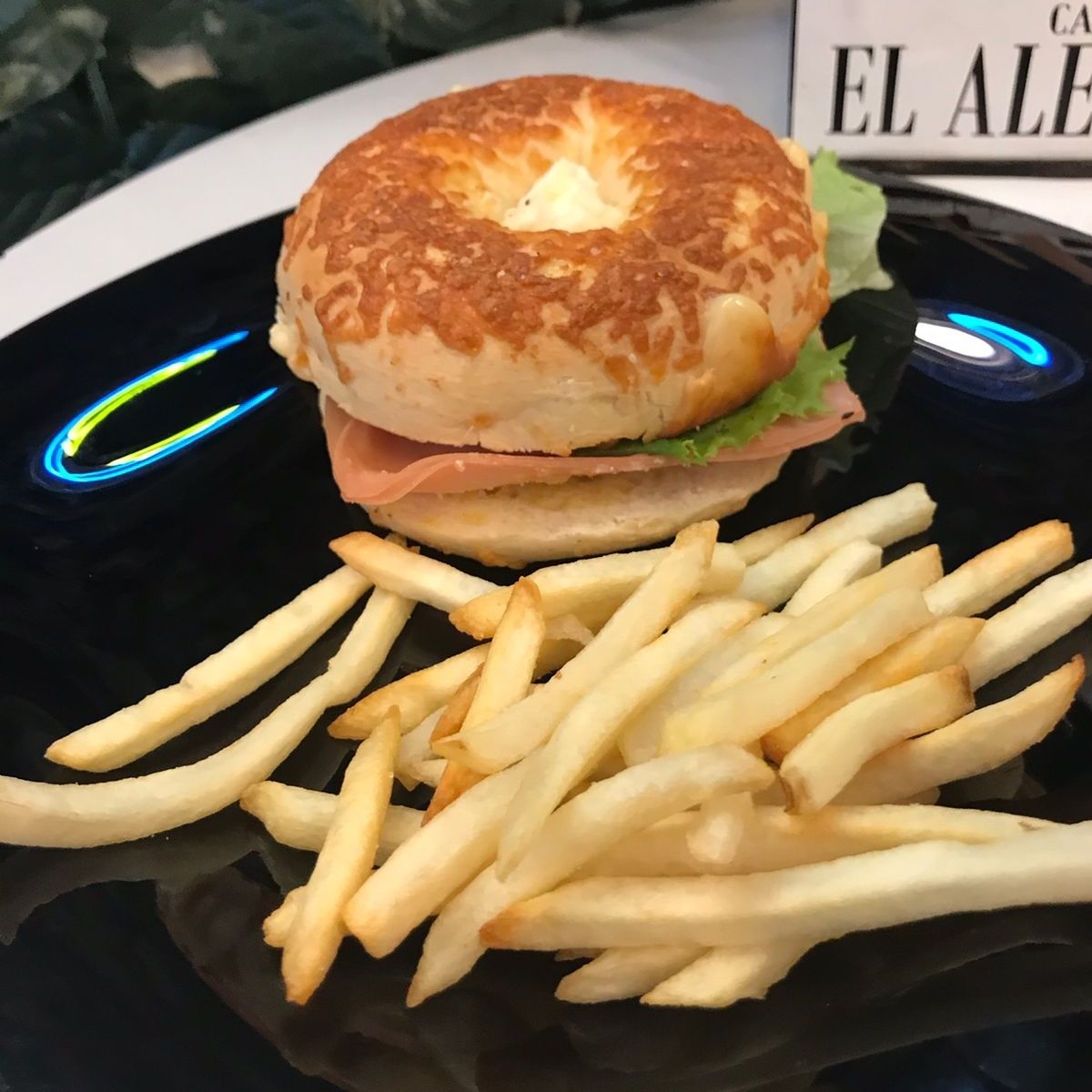 Pan artesanal relleno con jamon, tocino, piña, queso manchego acompañado de lachuga y papas fritas