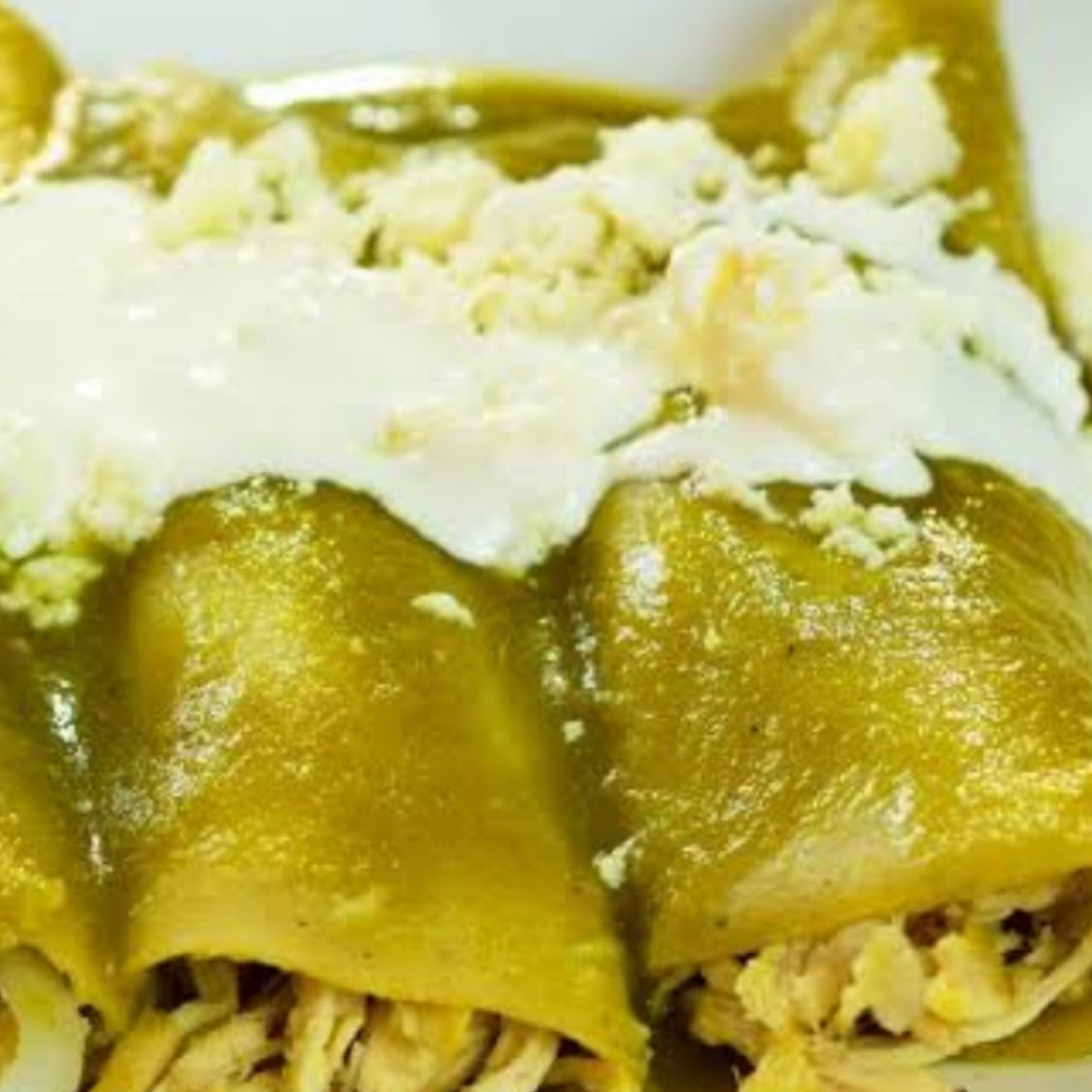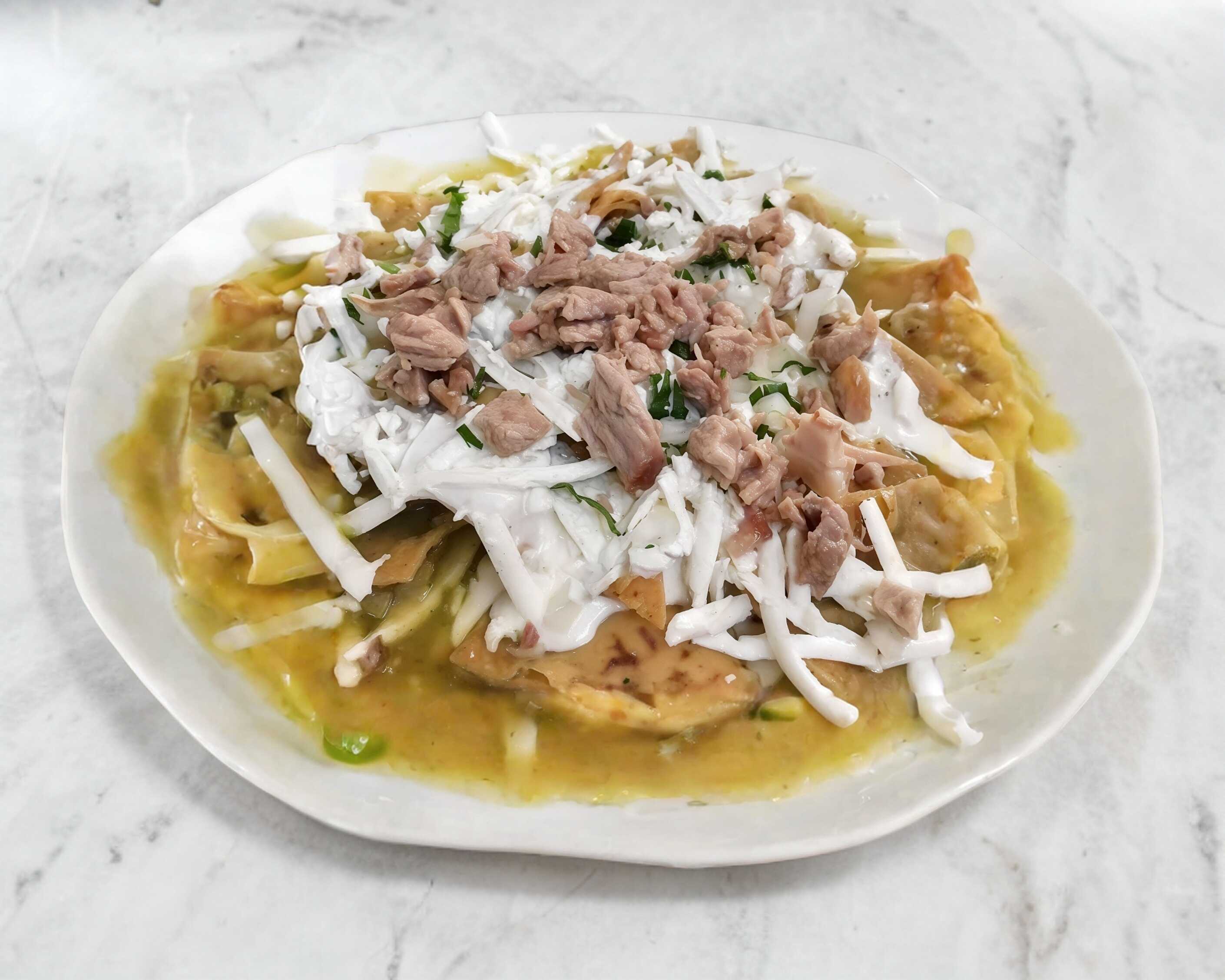 Crema,queso,lechuga,pollo,totopos bañados en salsa verde
