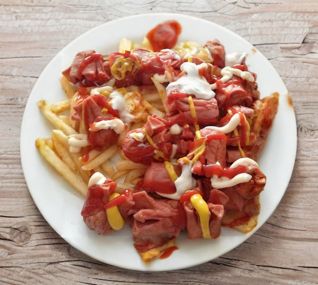 salchicha frita en forma de pulpo, crema,capsu,salsa