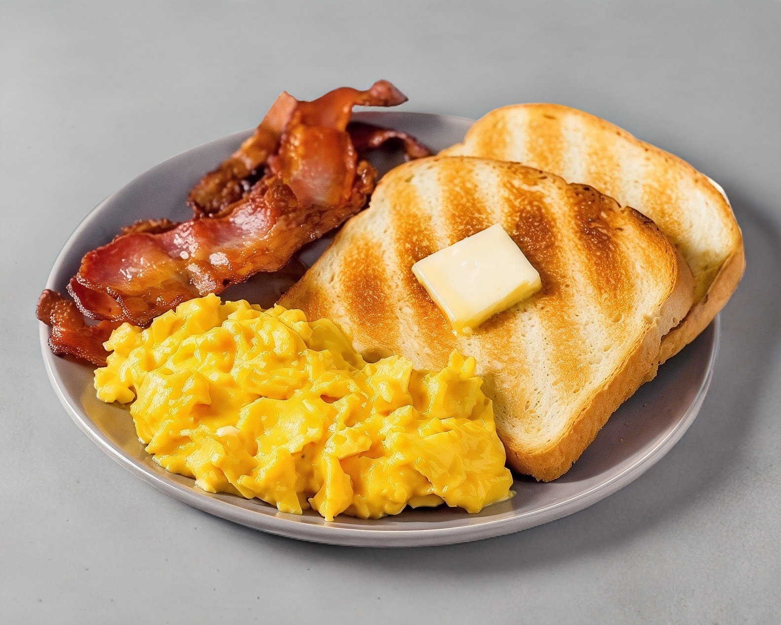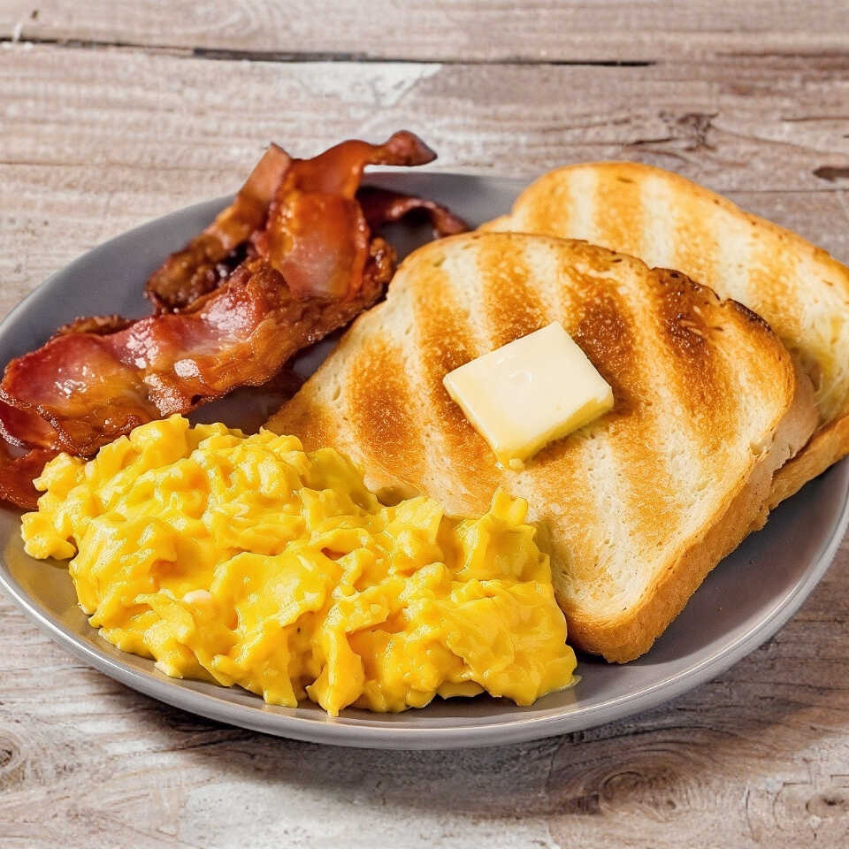 Revueltos o estrellados con tocino. Acompañados de frijoles, salsa, pan tostado o tortillas.