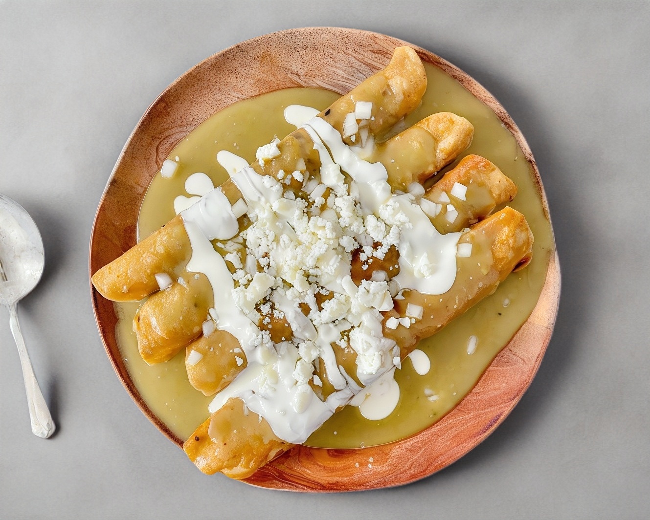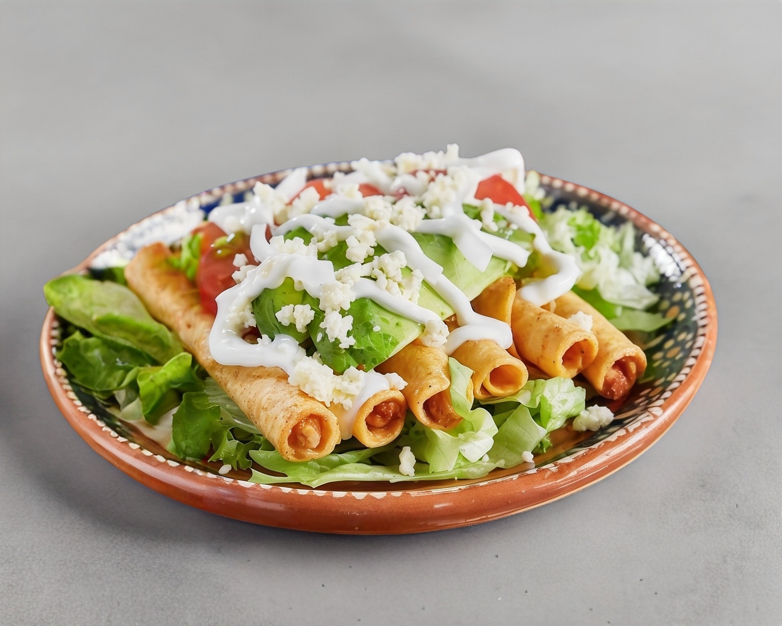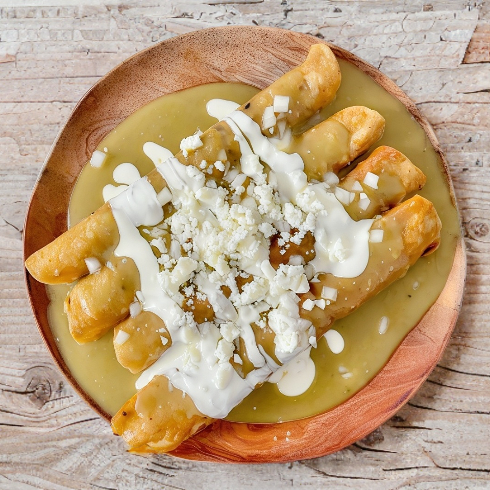 Tortillas doradas rellenas de pollo en salsa verde acompañadas de lechuga, crema y queso.
