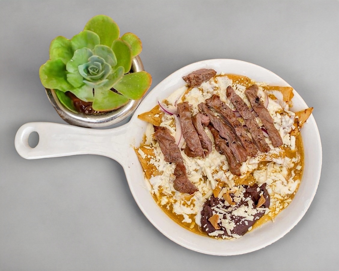 Totopos dorados bañados en salsa verde acompañados de chorizo, pollo, cecina, crema y queso.