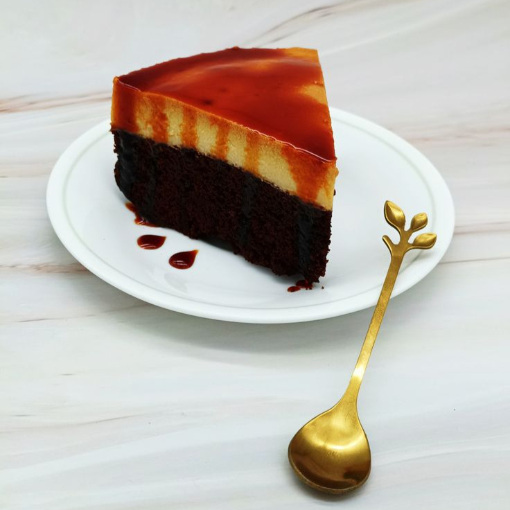 Delicioso pastel de chocolate con flan de leche