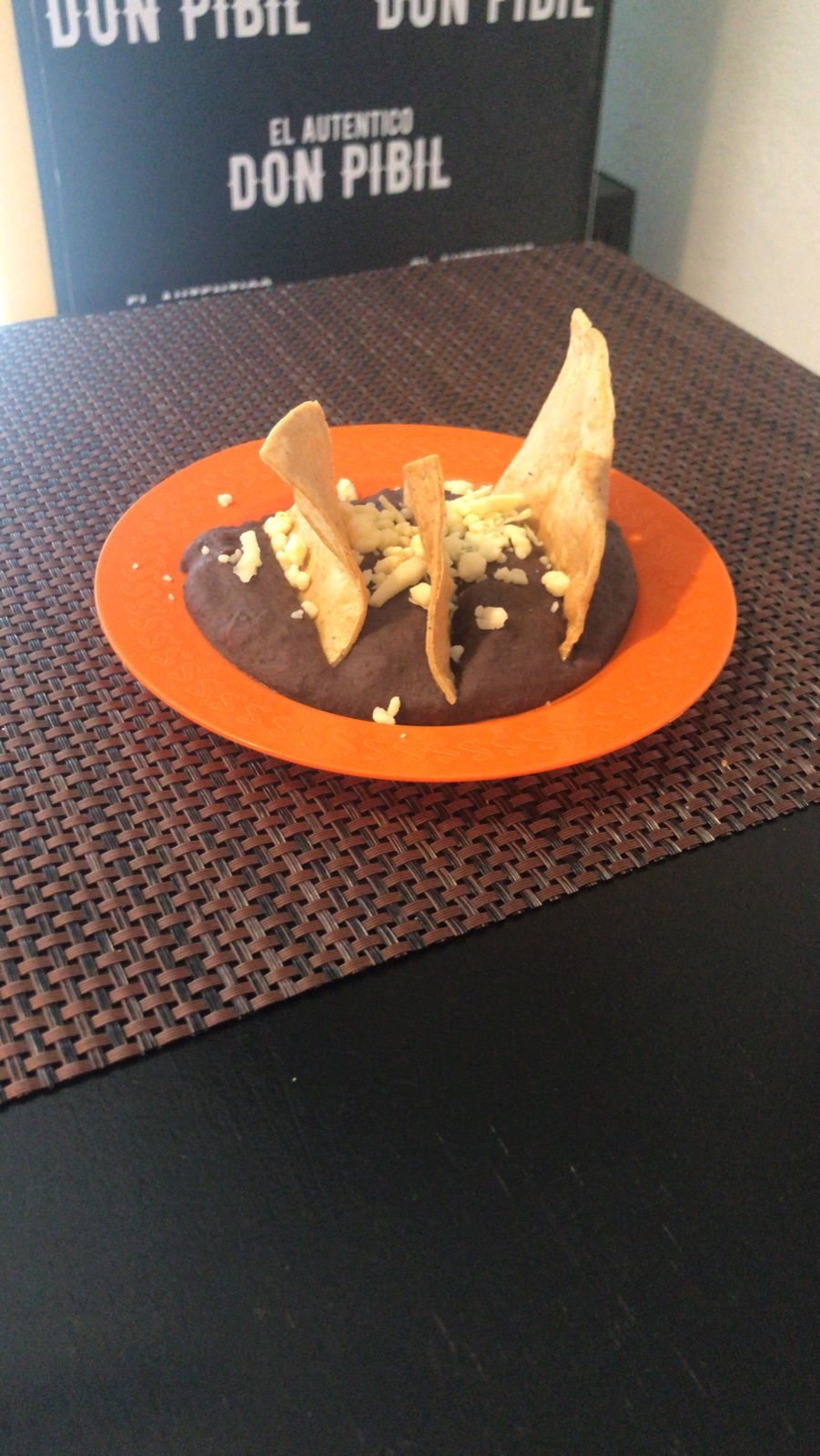 Tortilla frita con frijoles cochinita y queso manchego gratinado