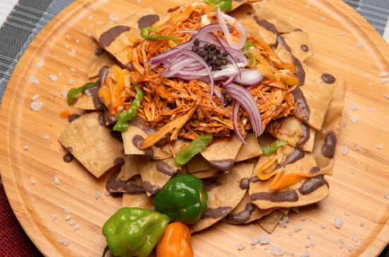 Totopos recién hechos, bañados con frijoles, cebolla morada,salsa habanera y nuestra auténtica cochinita pibil