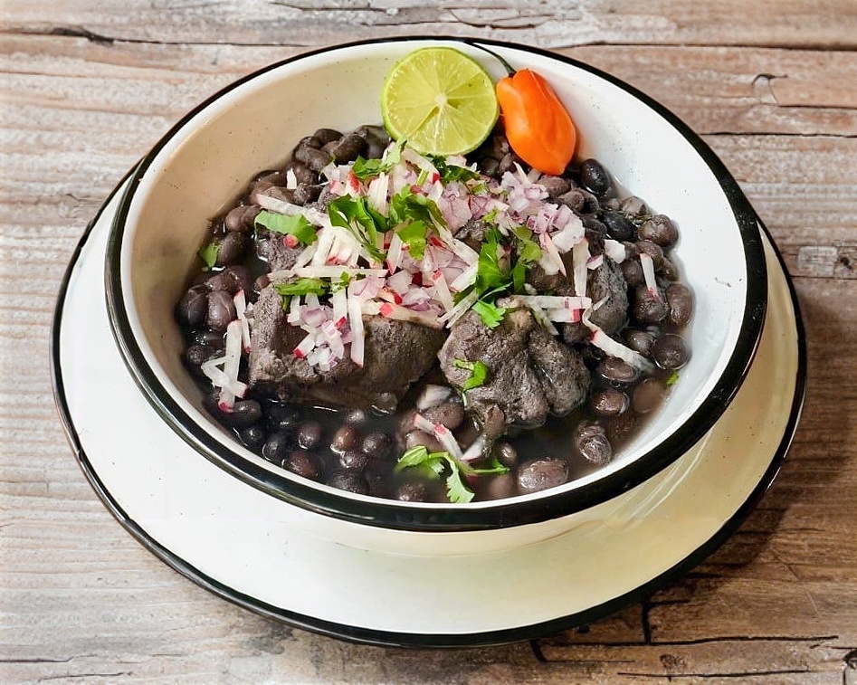 Frijol de olla cocinado con costilla de cerdo, acompañado de salsa picada con rábano, cebolla, cilantro,limón salsa habanera y tortillas