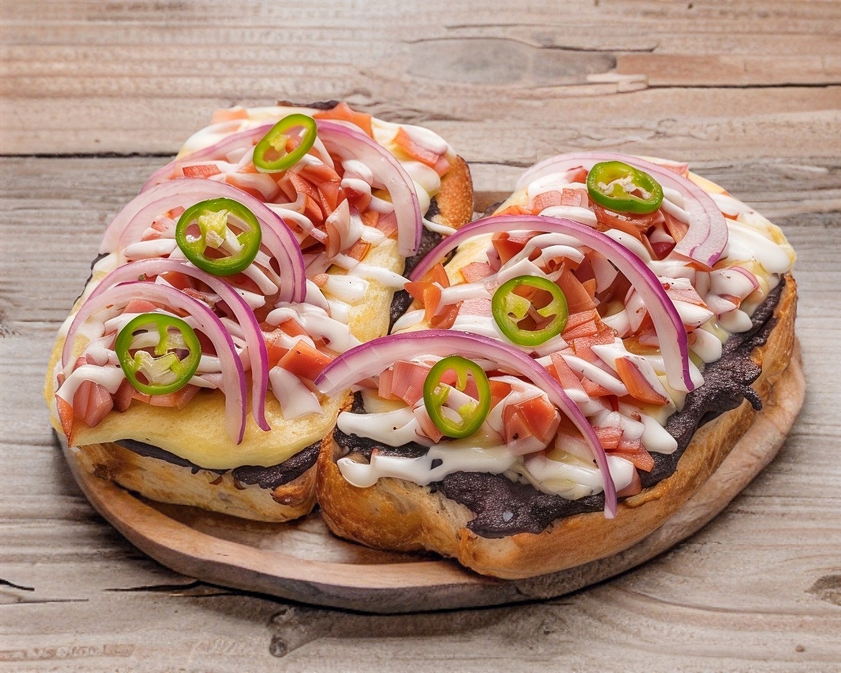 Auténticos molletes ,pan bolillo ,frijoles refritos, gratinados con queso mozarella incluye deliciosa cebolla morada y salsa habanera