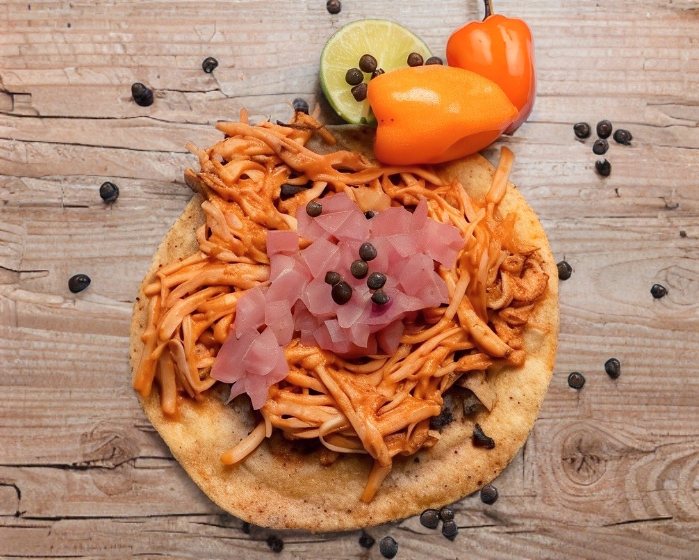 Tortilla de harina grande, untada de frijoles refritos con nuestra auténtica cochinita pibil, cebolla morada y salsa habanera