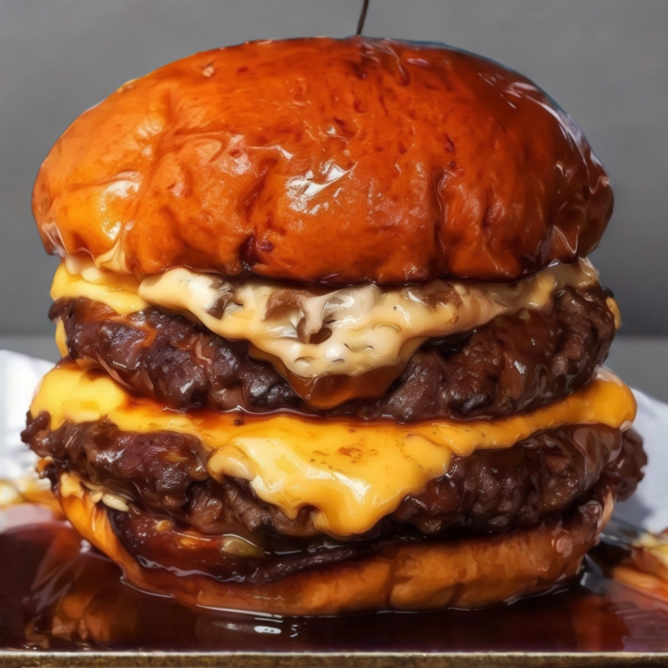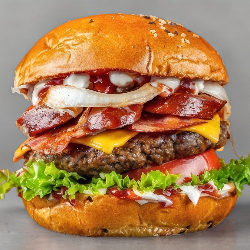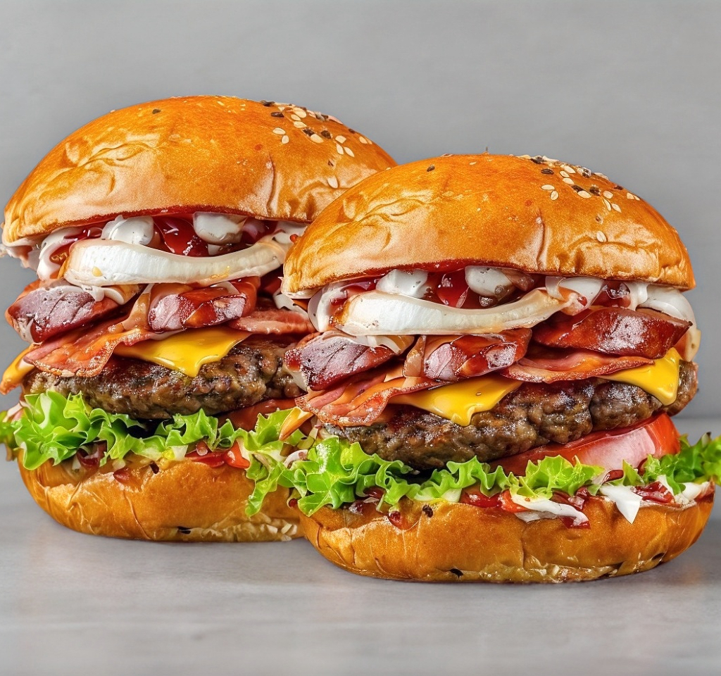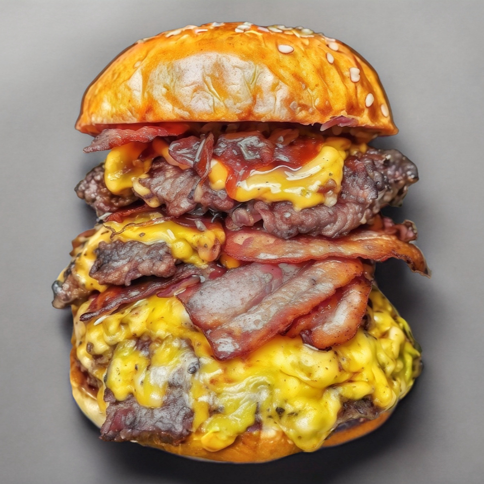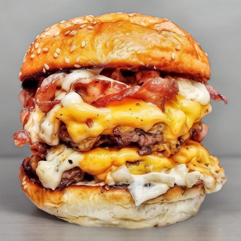 Tres jugosos medallones de carne hechos a la parrilla 🍖, crujiente tocino 🥓 y queso amarillo derretido 🧀, todo servido en un suave pan brioche. Con el toque clásico de catsup 🍅. ¡Ideal para los amantes de lo extremo! 😋
