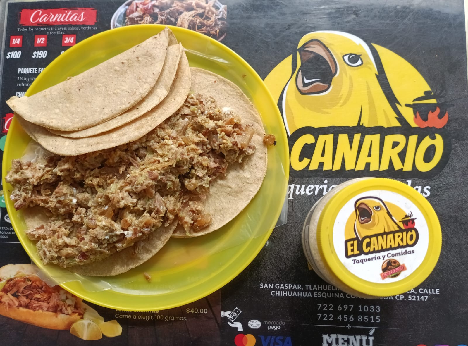 1/4 de carnitas, incluye salsas, verduras y tortillas.