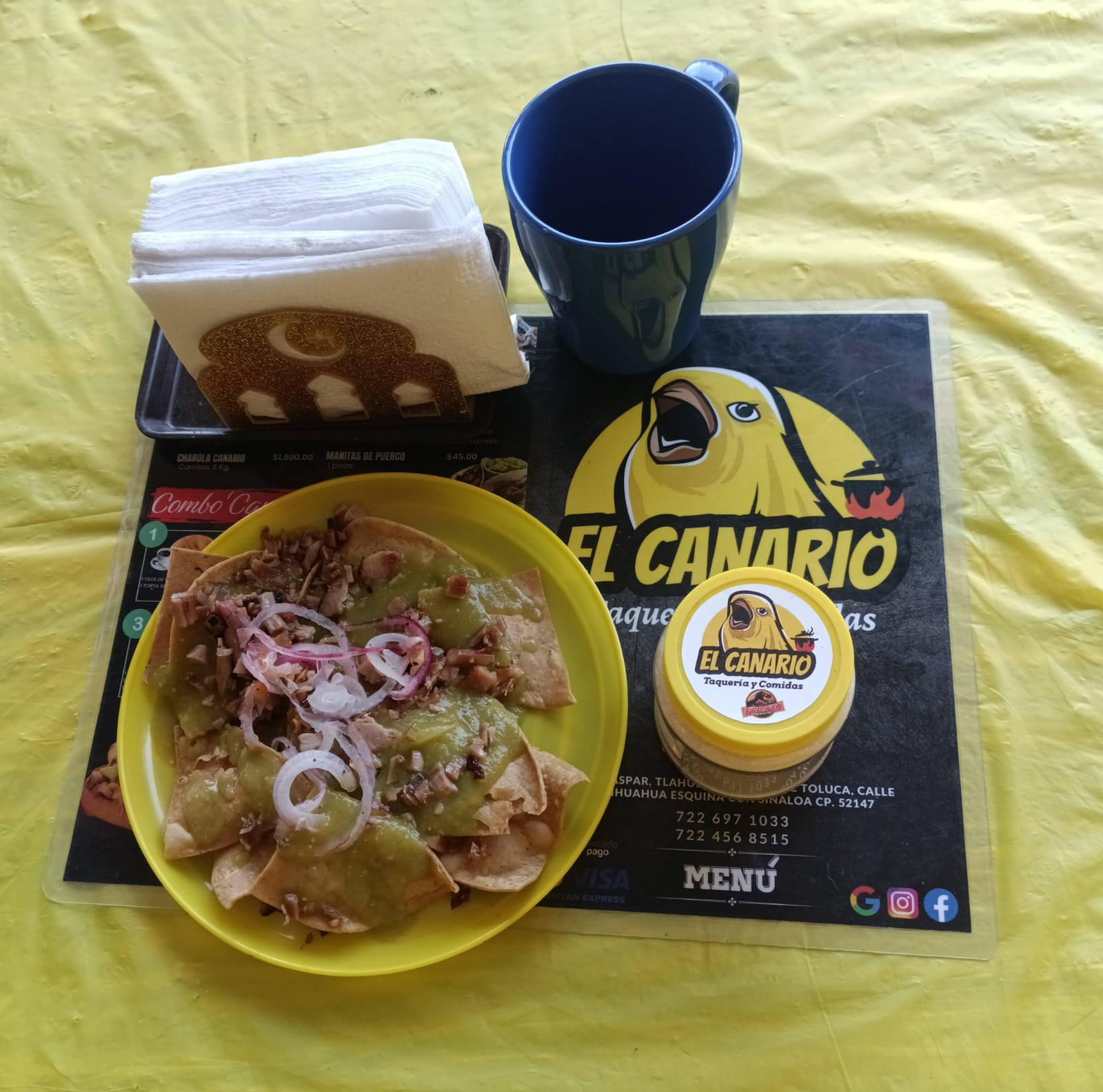 1 Taza de café mexicano y una orden de chilaquiles mini (100 gramos)