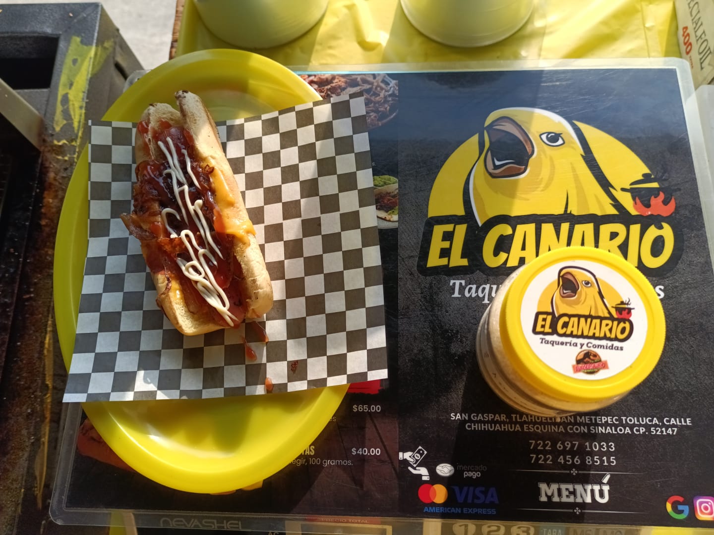 Salchicha de carne, queso amarillo, jitomate, cebolla y aderezo dino.