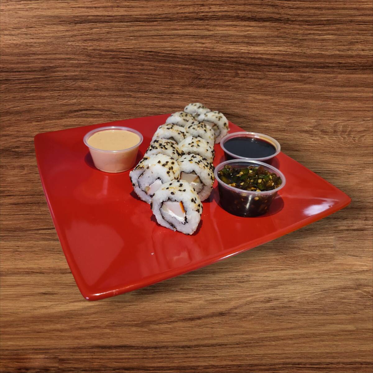 Clásico y siempre favorito. Relleno de surimi, pepino y queso crema, envuelto en arroz y ajonjolí blanco y negro.se sirve con 1oz de salsa de soya preparada, 1oz de aderezo de mayonesa con chipotle y 1 porcion de chiles serranos en salsa de anguila. Un sabor equilibrado que nunca falla.