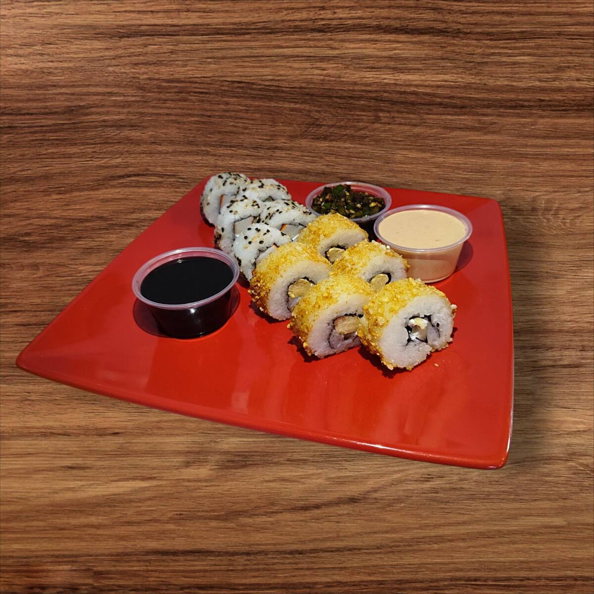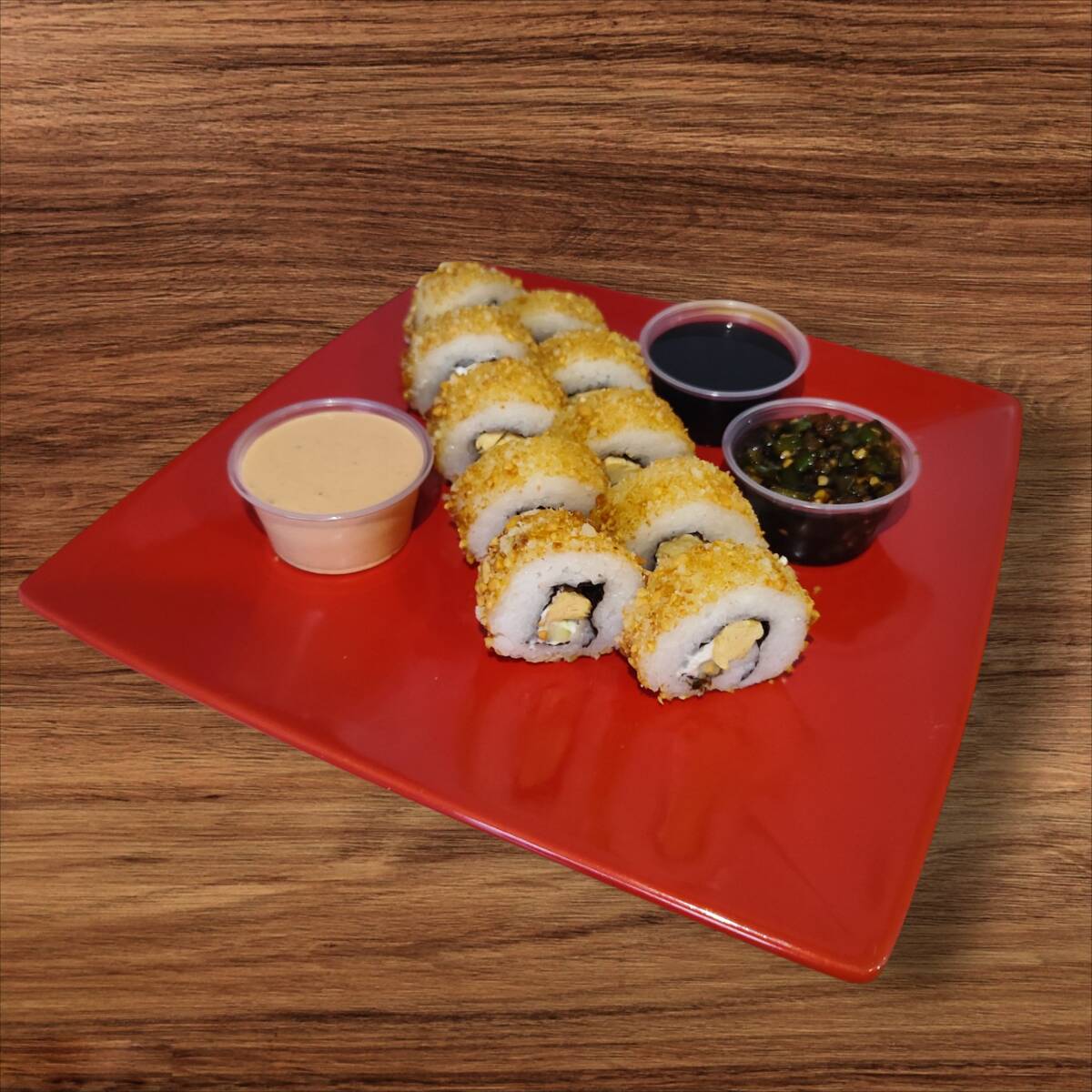 Relleno de pollo sazonado, queso crema y pepino, cubierto con arroz y panko japones fusionado con cacahuate en trozos tostado. se sirve con 1oz de salsa de soya preparada, 1oz de aderezo de mayonesa con chipotle y 1 porcion de chiles serranos en salsa de anguila. Ideal para quienes buscan una opción sabrosa y diferente.