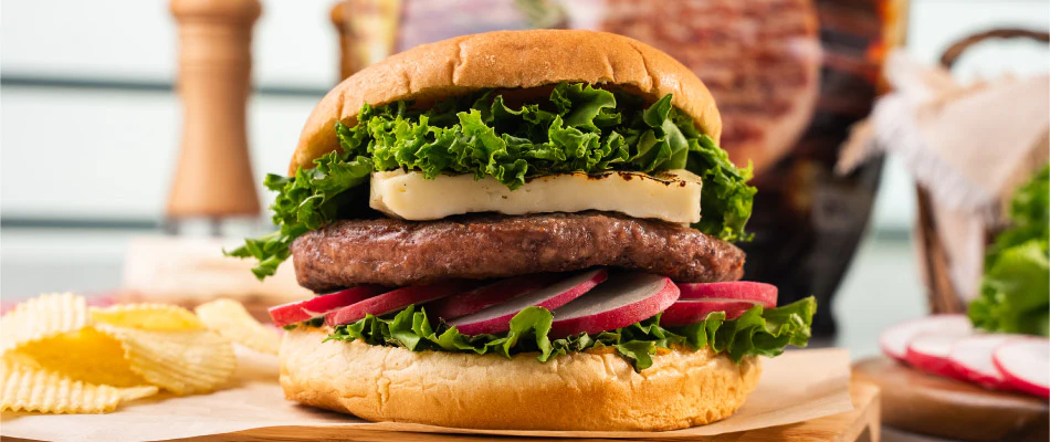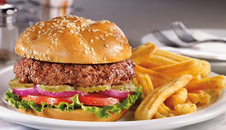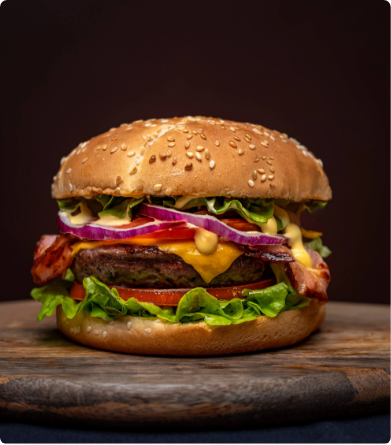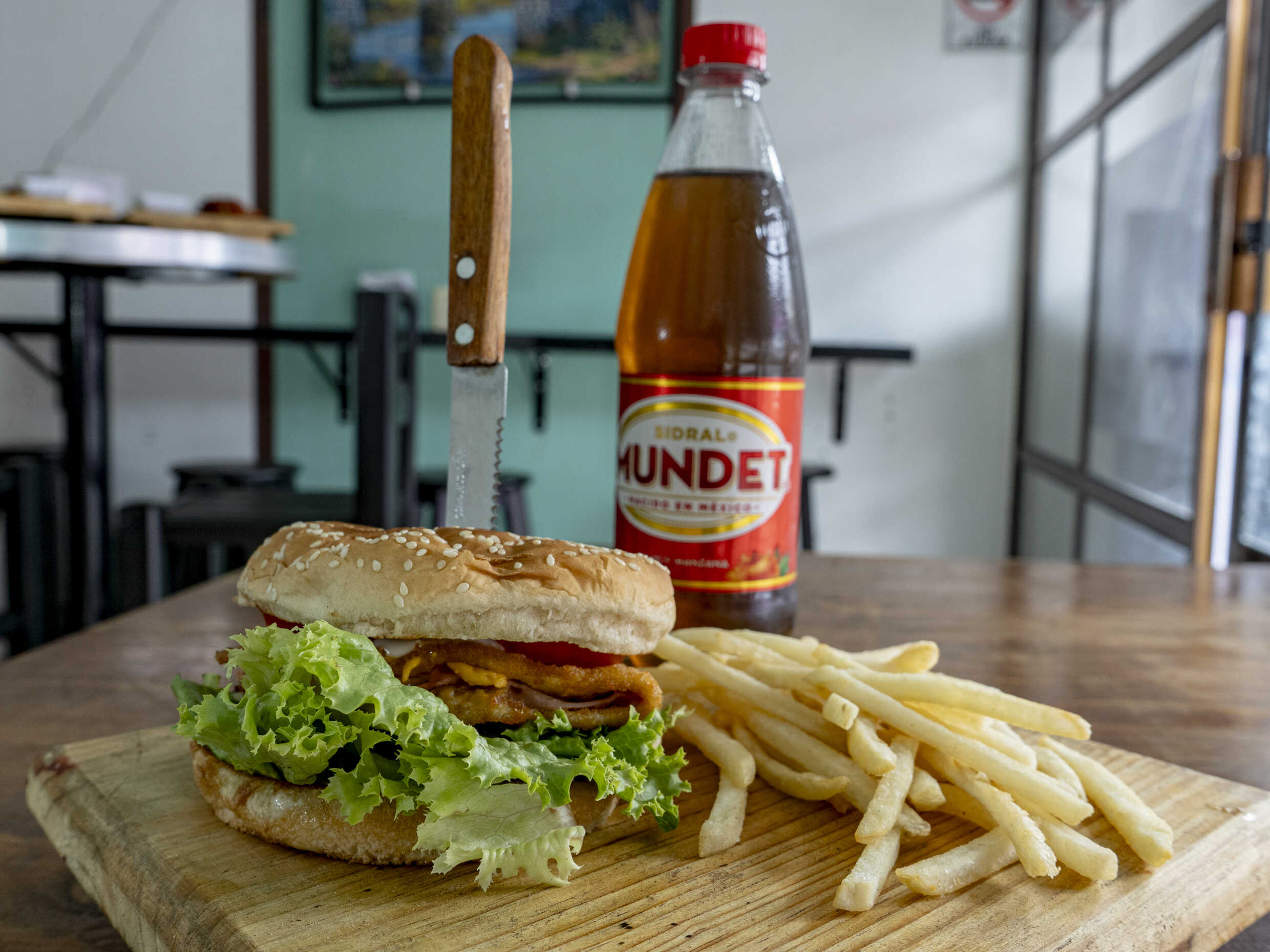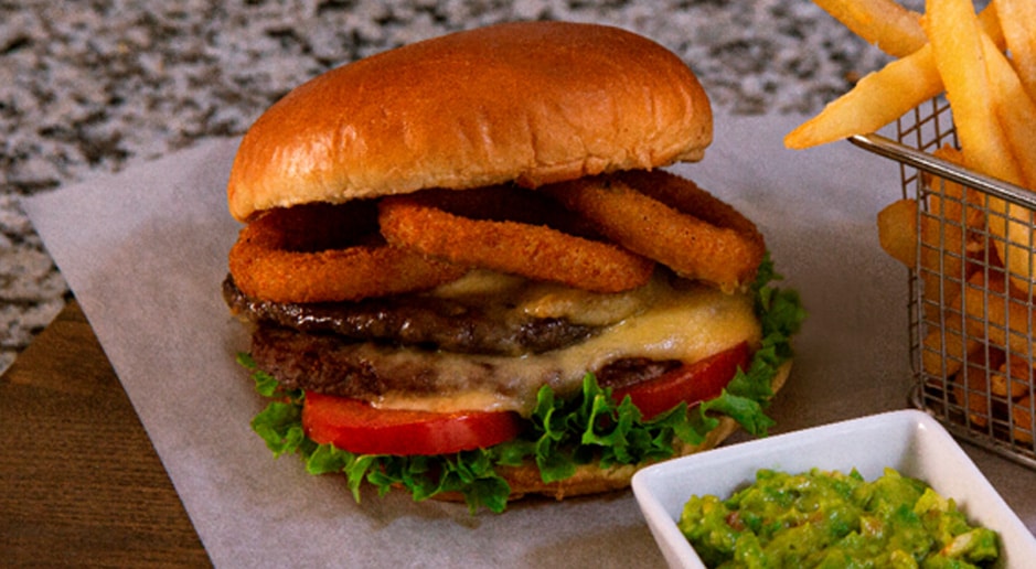 Carne de res, jamón, queso amarillo y aros de cebolla, acompañado de cebolla carameliza, lechuga, jitomate y salsa BBQ.