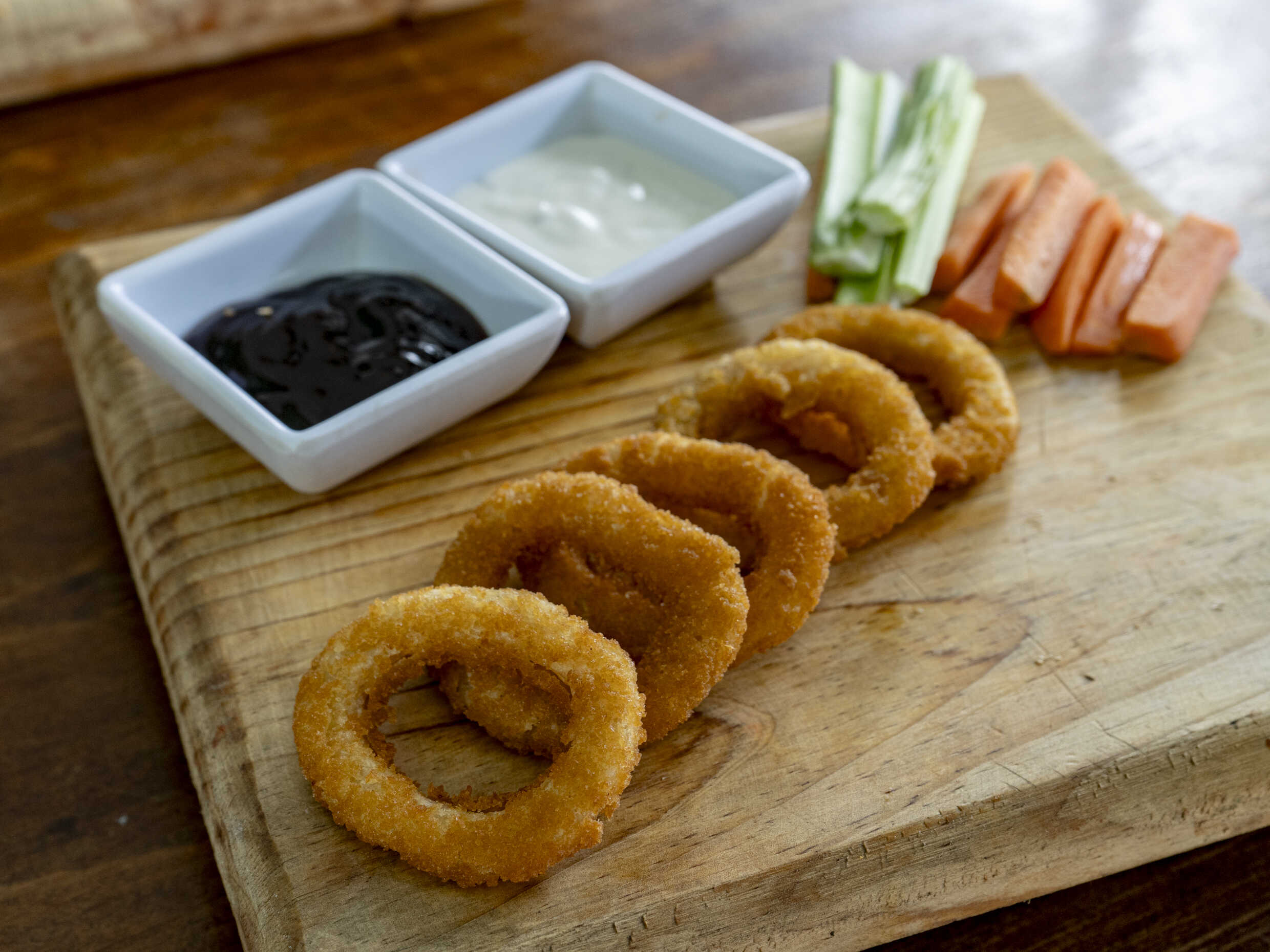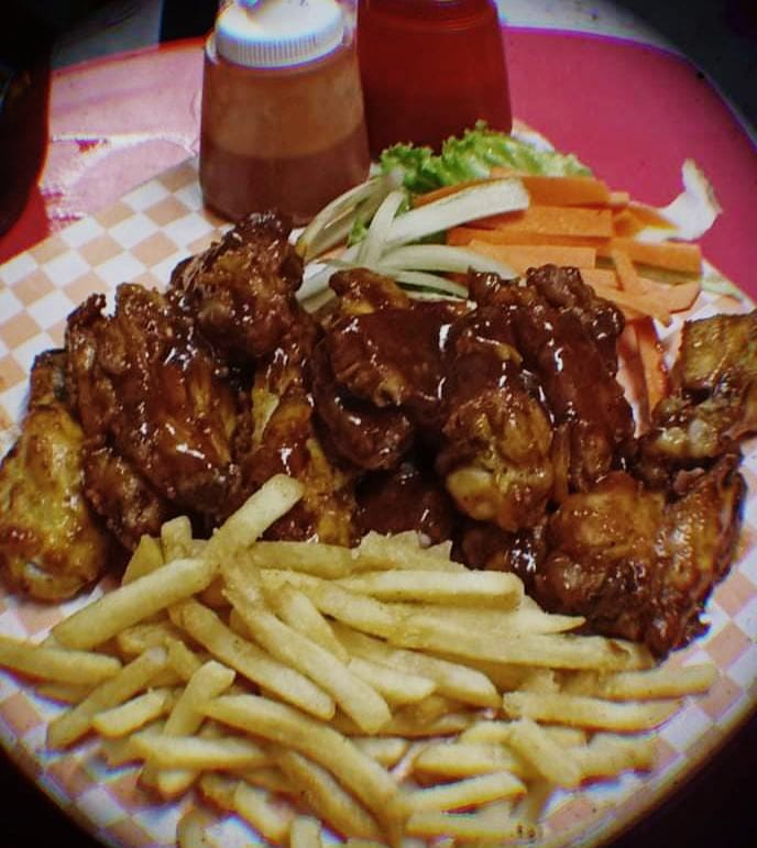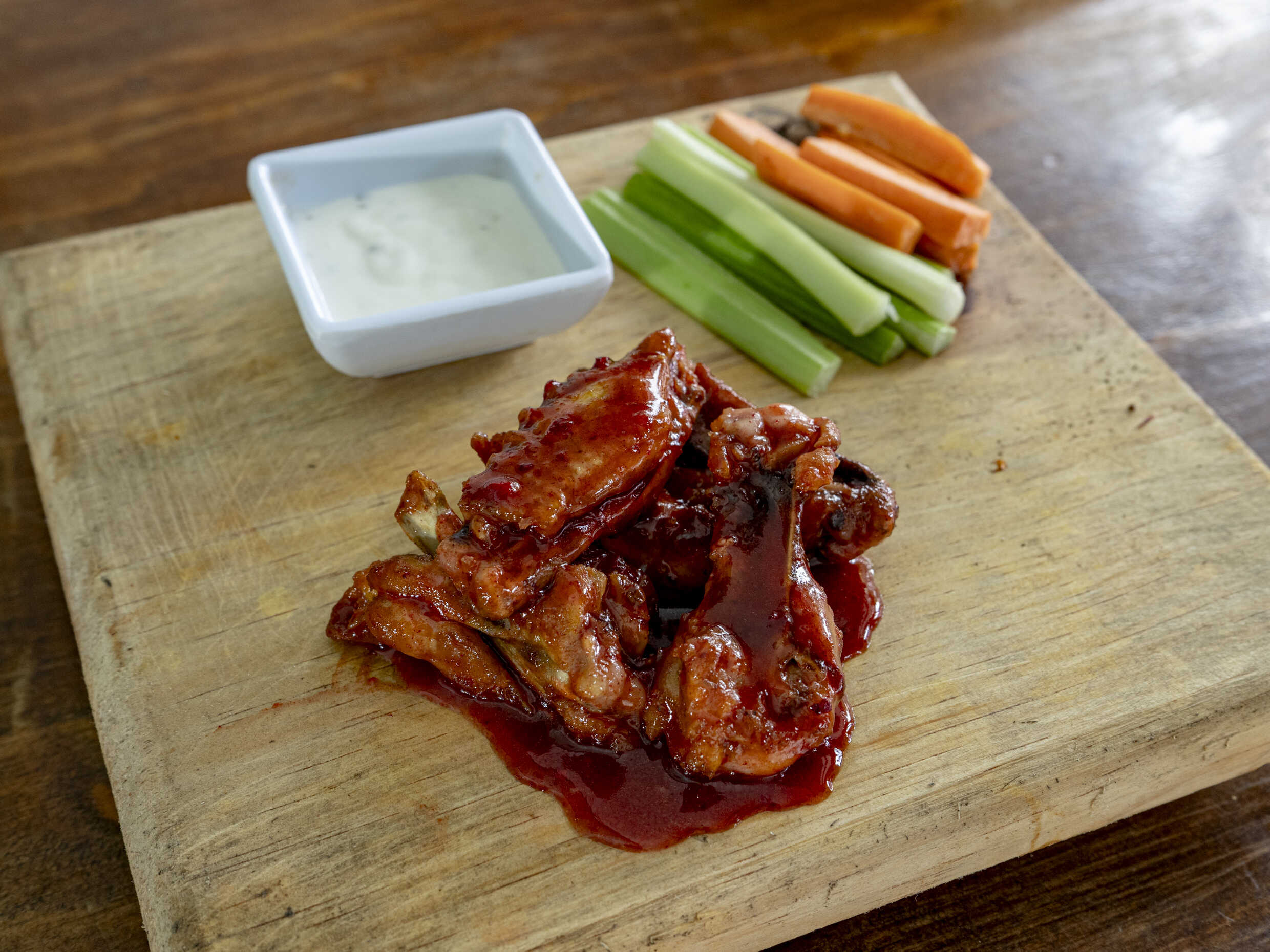 Boneless bañados en salsa de tu preferencia con aderezo ranch, acompañado de cebolla carameliza, lechuga, jitomate y salsa BBQ.