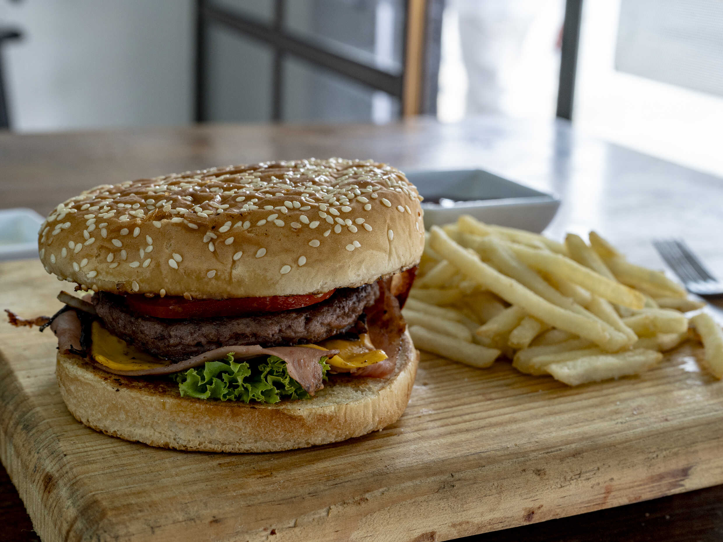 Doble carne, tocino, jamón y queso amarillo, acompañado de cebolla carameliza, lechuga, jitomate y salsa BBQ.