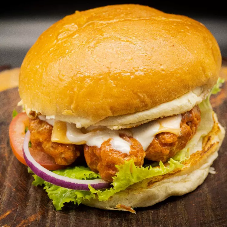 Milanesa de pollo rellena de queso amarillo, jamón, queso manchego y bañado en aderezo ranch, acompañado de cebolla carameliza, lechuga, jitomate y salsa BBQ.