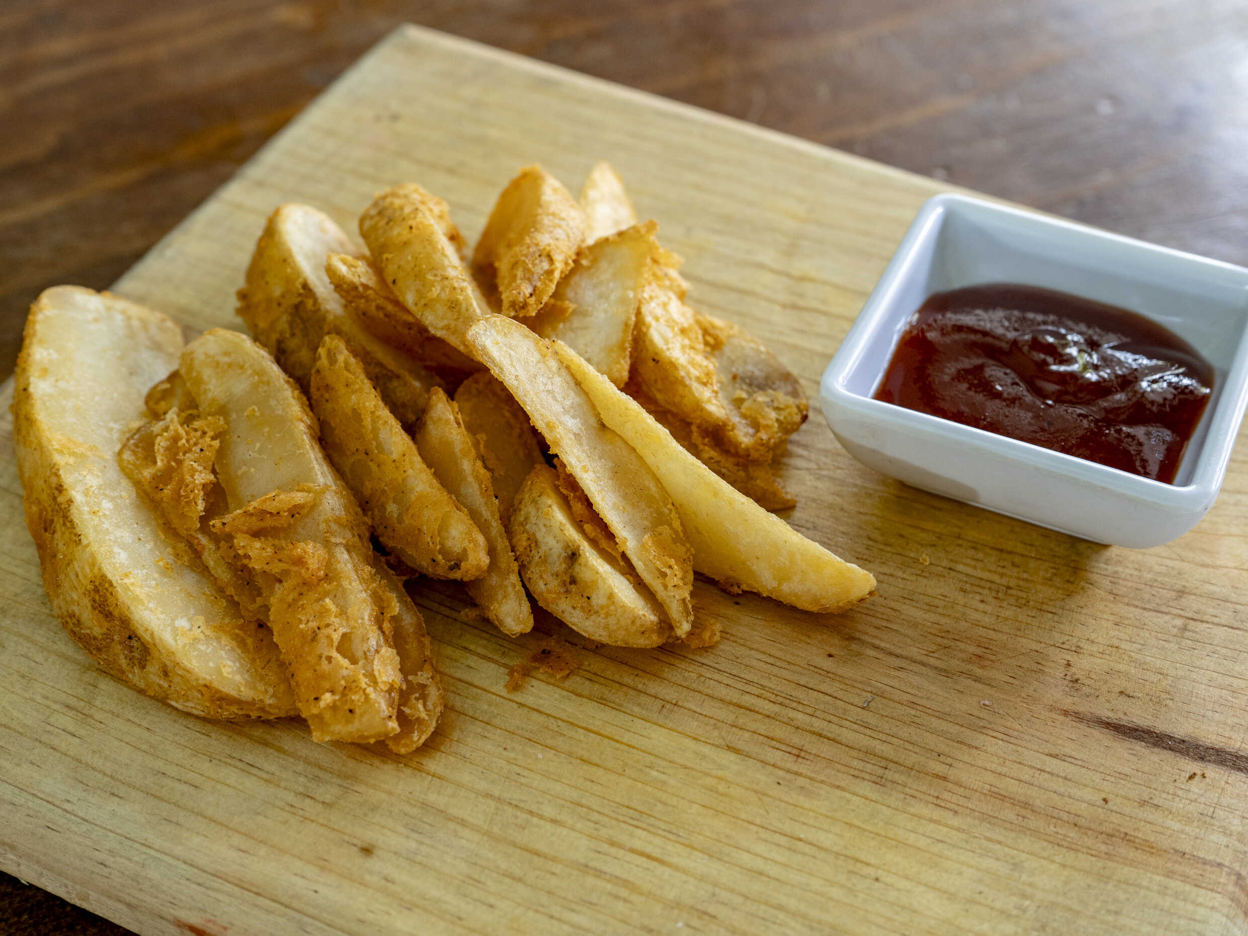 Salchichas con papas francesas condimentadas con queso parmesano y limón.