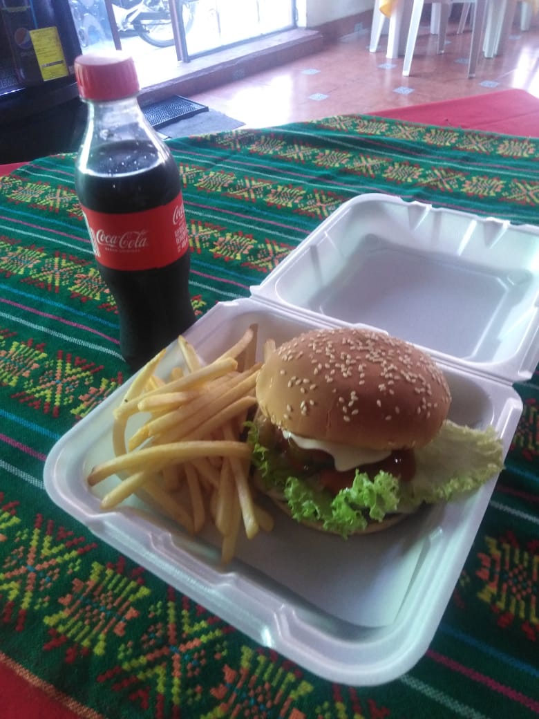 Carne 100% res, queso blanco, lechuga, tomate rojo, cebolla, pepinillos, y aderezos, acompañada de papas a la francesa.