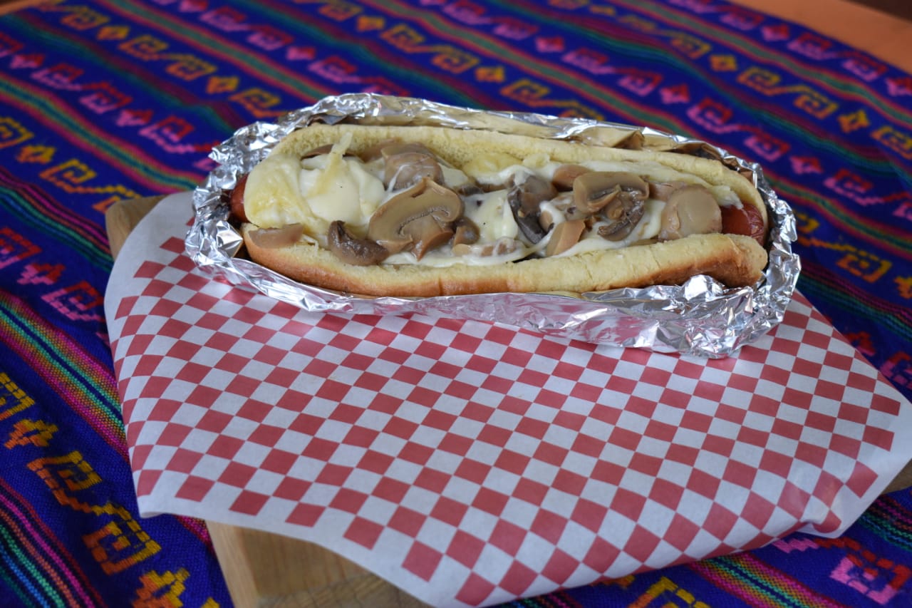 Salchicha 100% res, tocino, champiñones, queso oaxaca, tomate rojo, cebolla, jalapeño y aderezos.