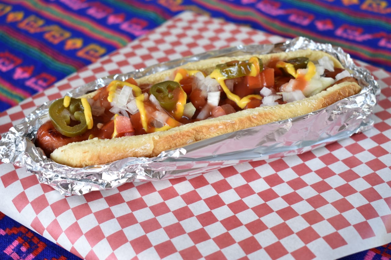 Salchicha 100% res, con tocino, tomate rojo, cebolla, jalapeño y aderezos.