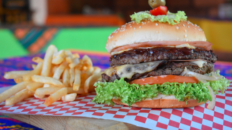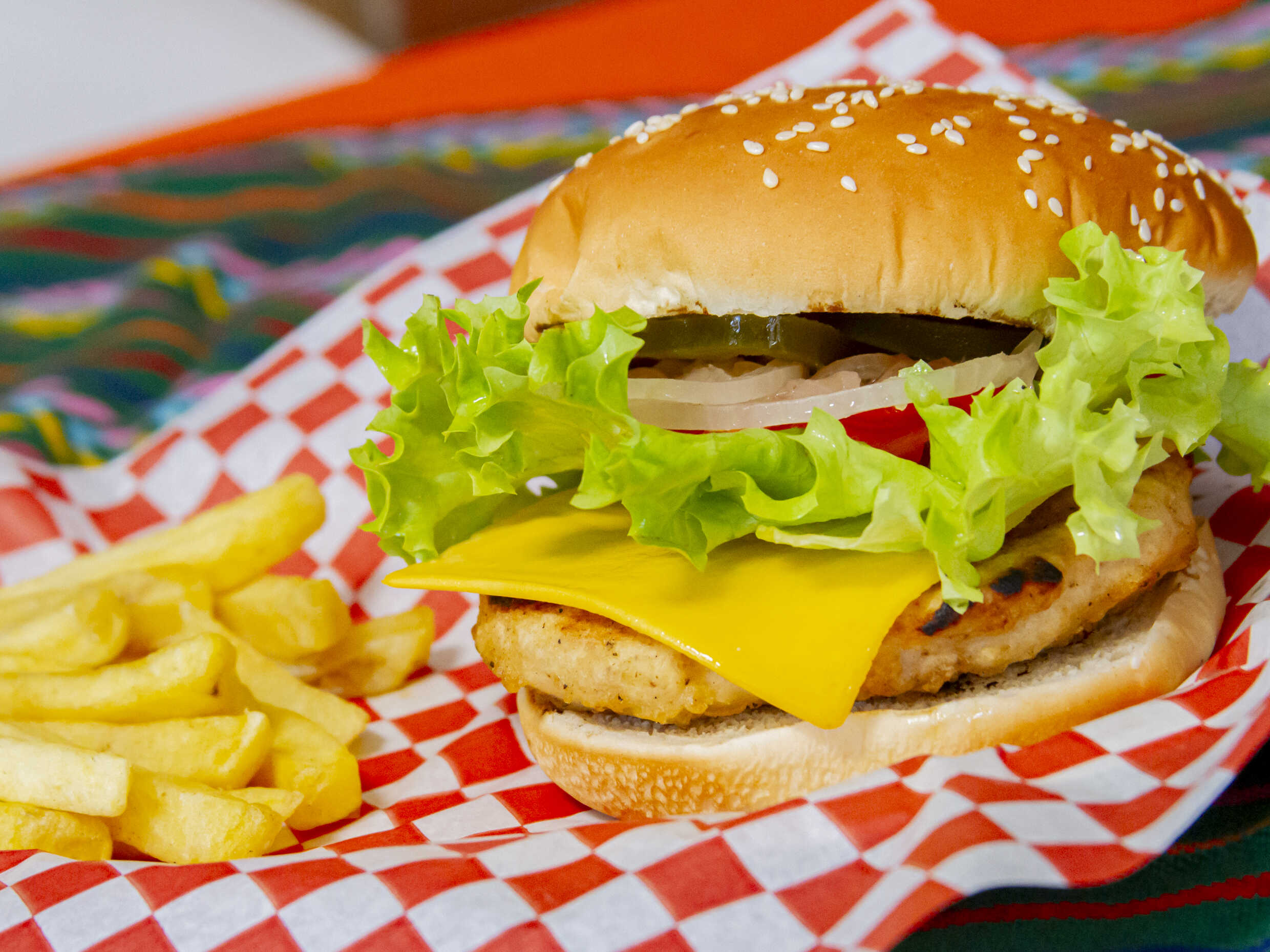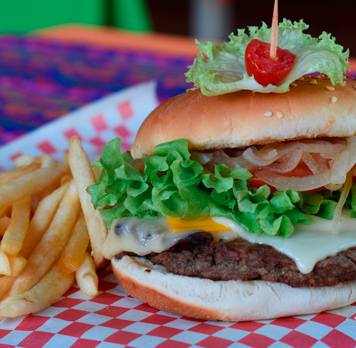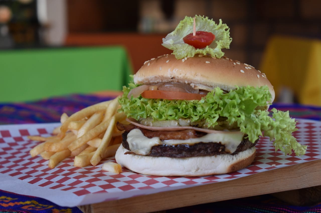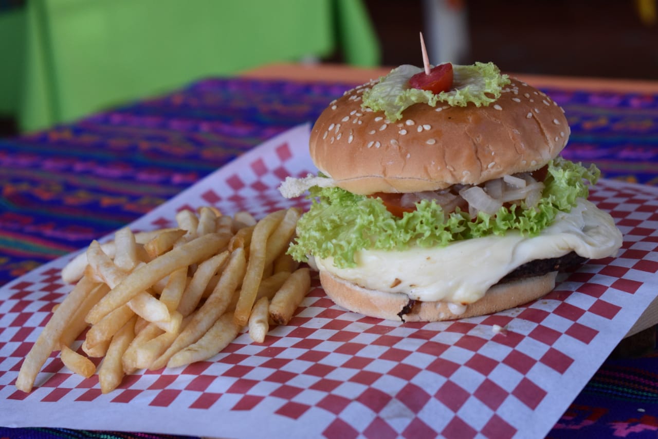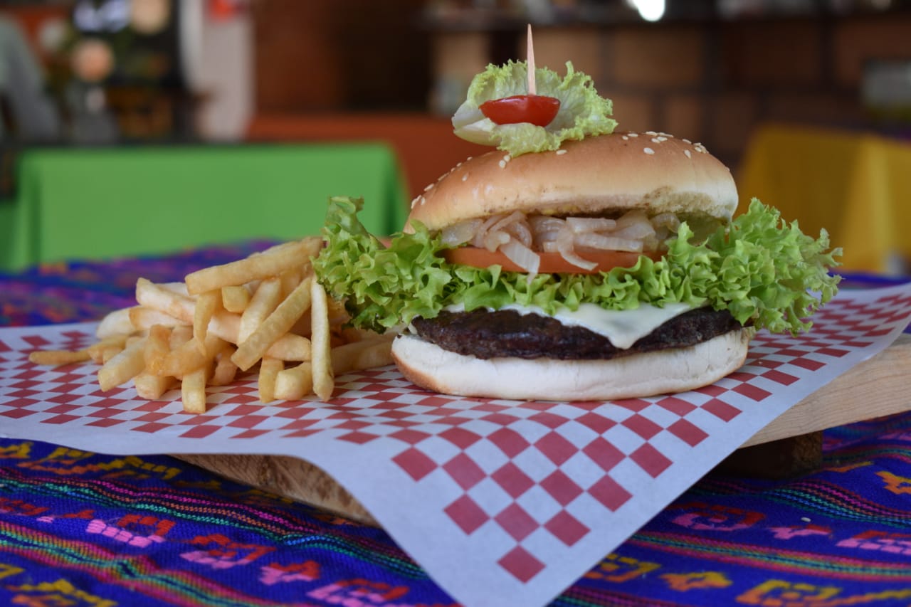 Carne 100% res, queso blanco, lechuga, tomate rojo, cebolla y aderezos, acompañada de papas a la francesa.