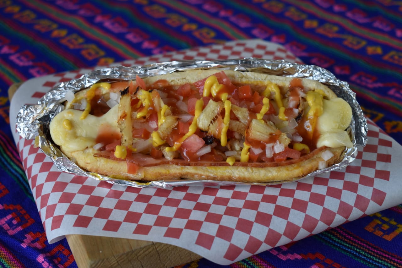 Salchicha 100% res, tocino, piña, queso oaxaca, tomate rojo, cebolla, jalapeño y aderezos.