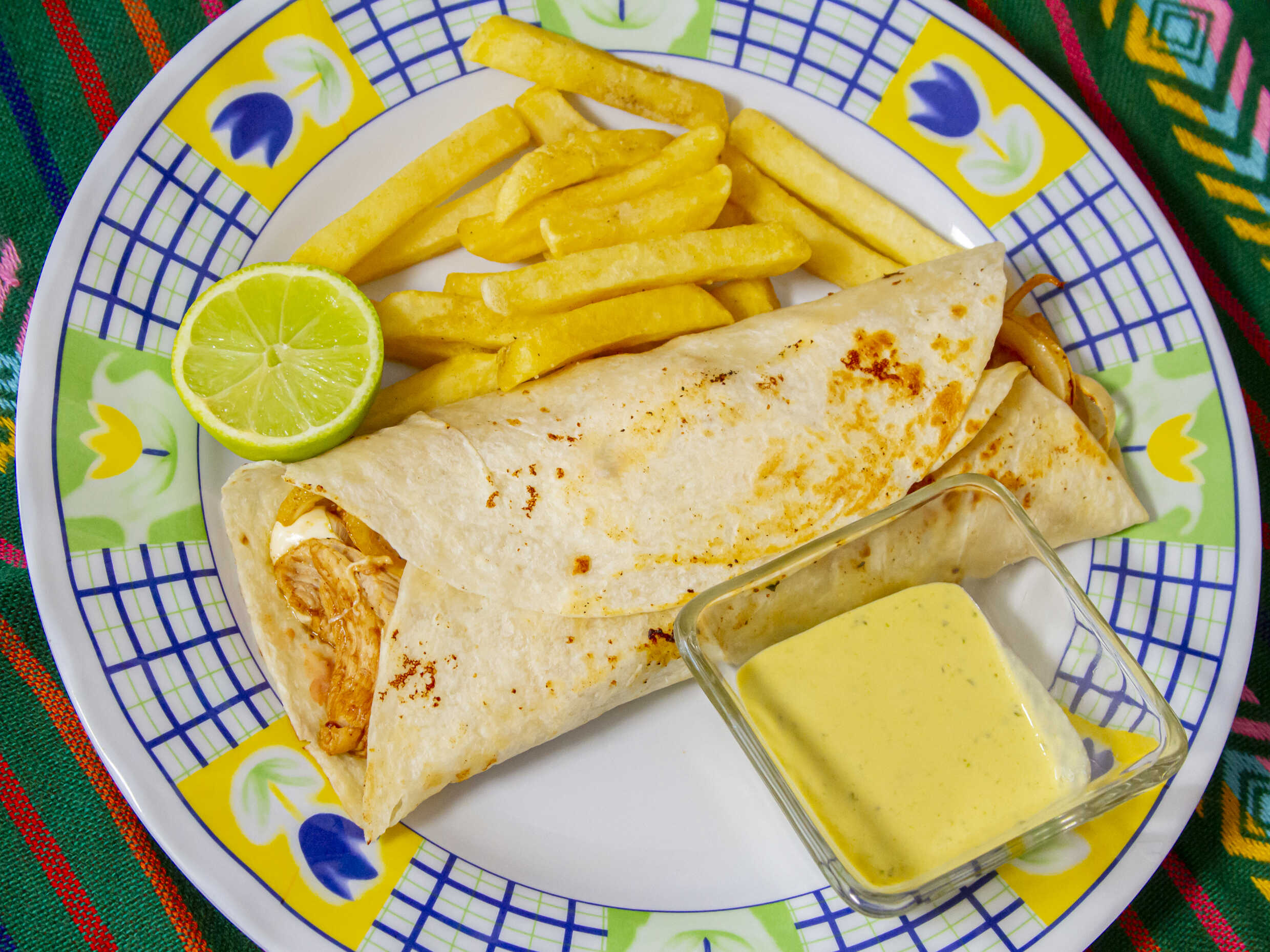 Tortilla de harina, carne al pastor, quesillo, acompañado refresco