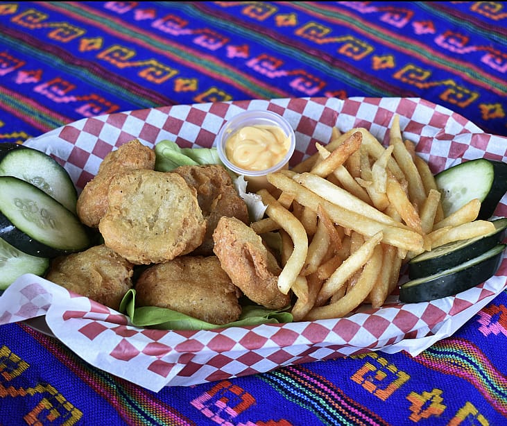 6 Pzas. de nuggets, con papas a la francesa y pepinos.
