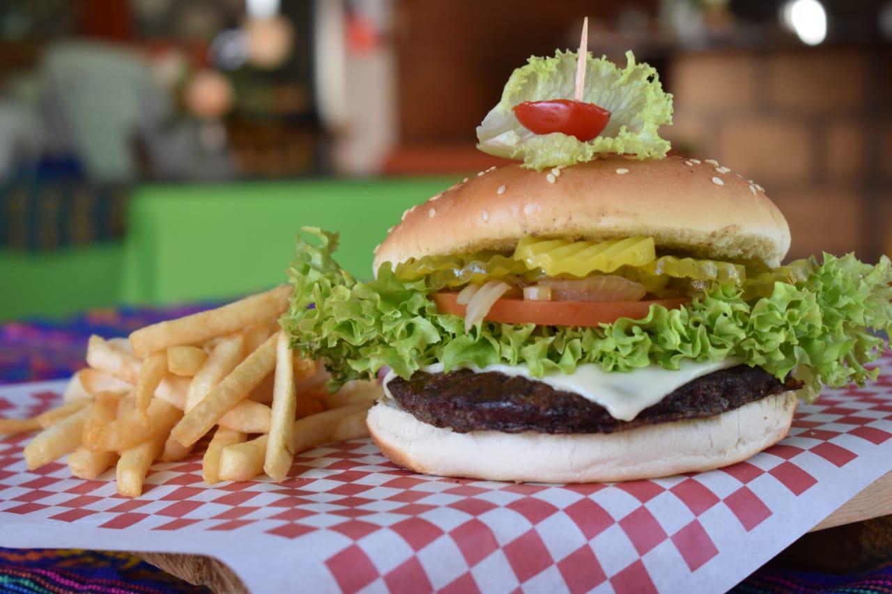 Carne 100% de res, queso oaxaca, lechuga, tomate rojo, cebolla y aderezos, acompañada de papas a la francesa.