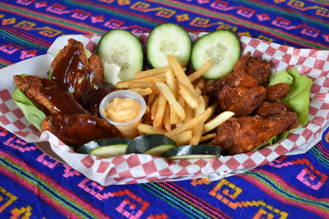 10 Pzas. de alitas con papas a la francesa y pepinos.