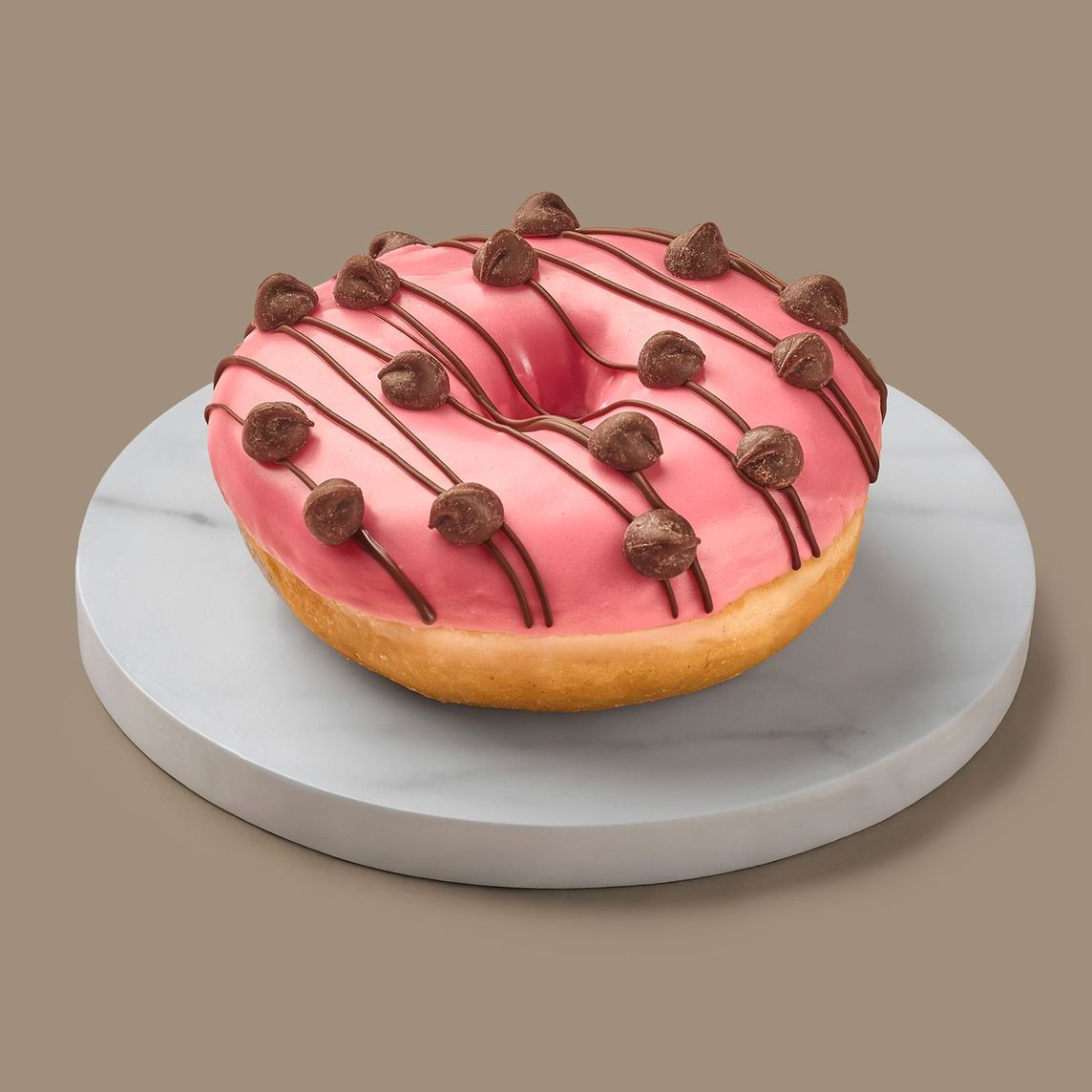 Dona de vainilla cubierta con glaseado de fresa, chispas y líneas de chocolate y chispas de chocolate. Dulce, divertida y perfecta para quitarte el antojo.