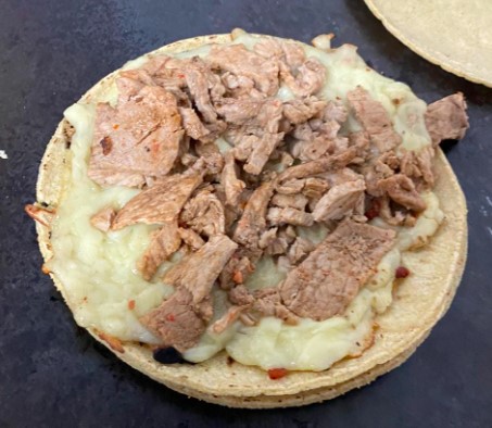 Tortilla de harina, queso manchego, frijoles, salsa y arrachera.