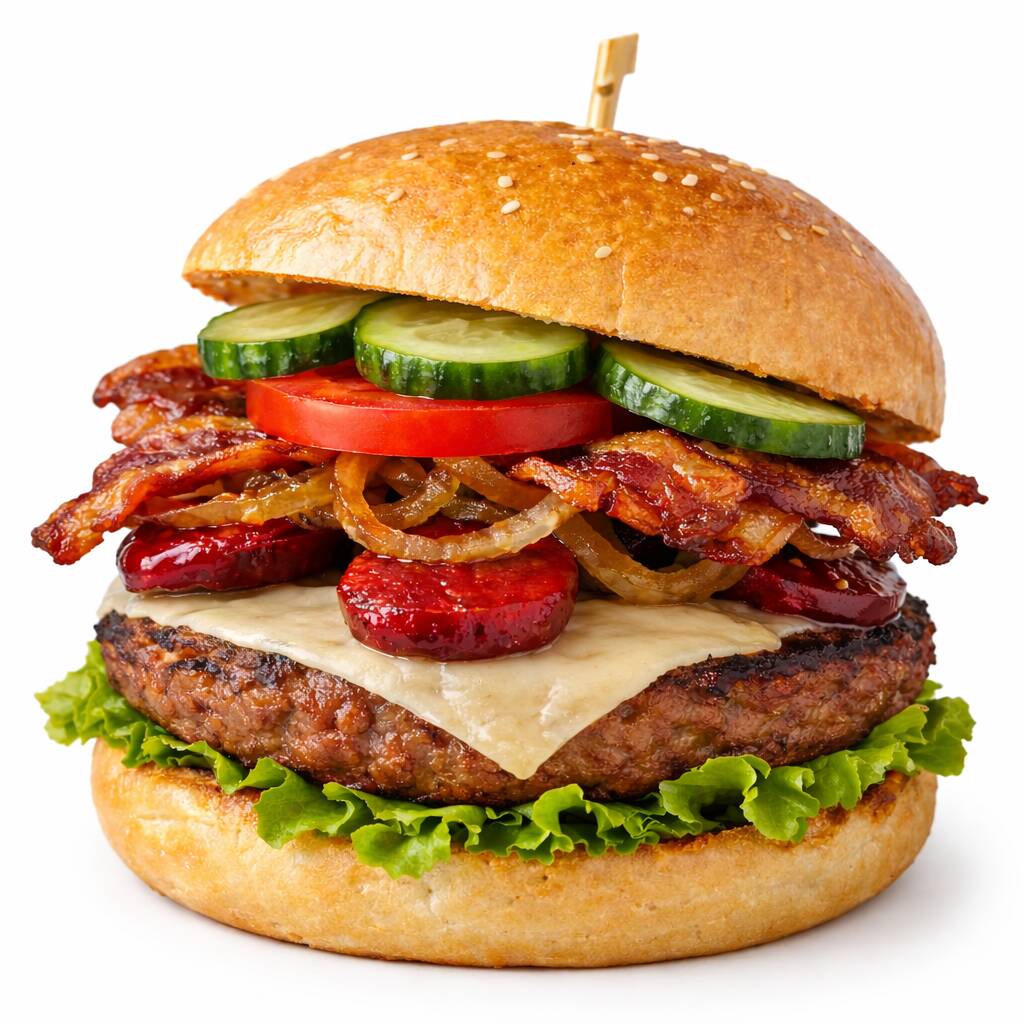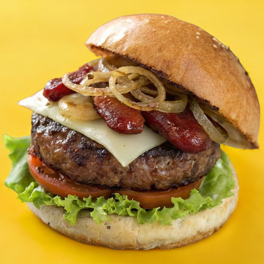 (1 Carne de Res, Aderezo, Queso Manchego, Champiñones, Tocino, Jitomate, Pepinillos, Cebolla Caramelizada y Lechuga)