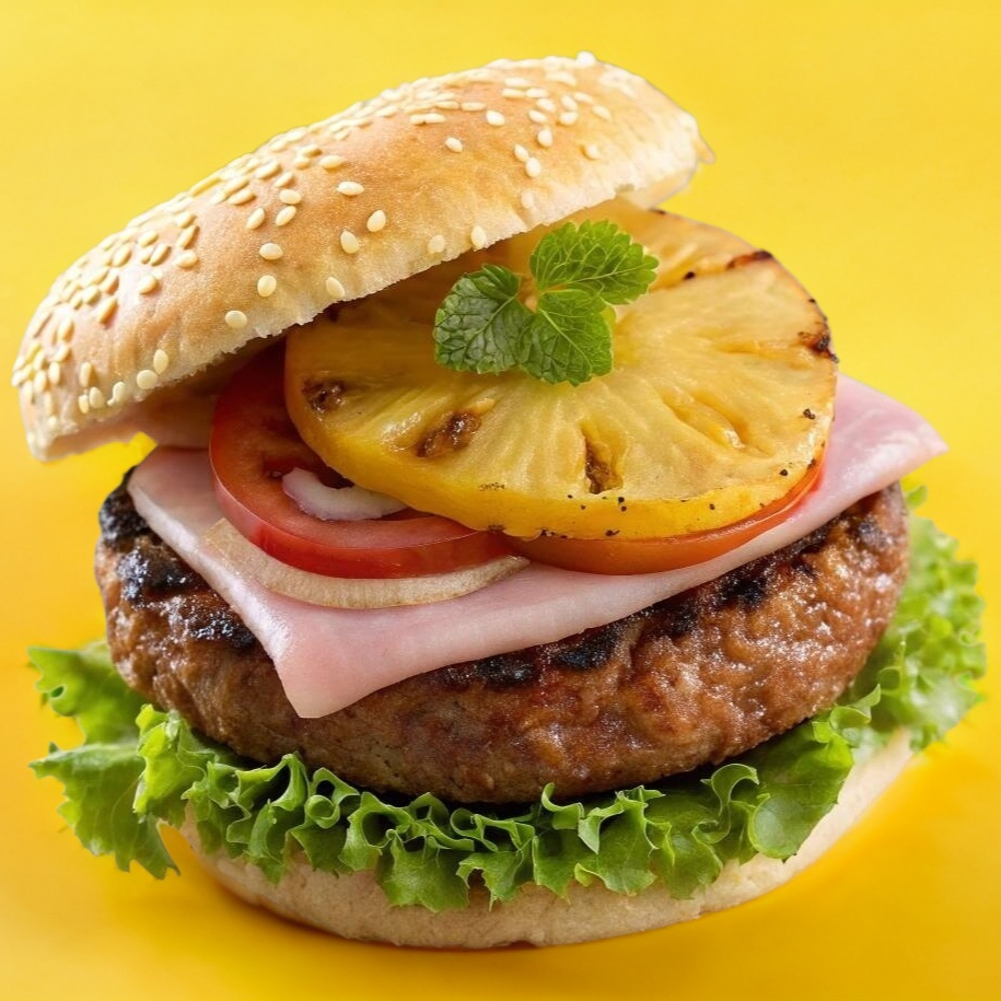 Hamburguesa con (1 Rebanada de piña, 1 Carne de res, jamon, Jitomate ,Cebolla Caramelizada ,Lechuga