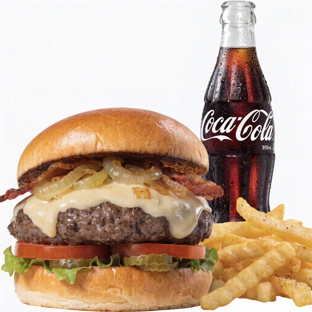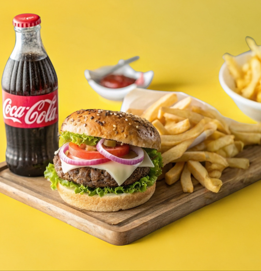 Una Hamburguesa Clásica De res mas una Coca-Cola de 355ml y 100g de papas a la francesa